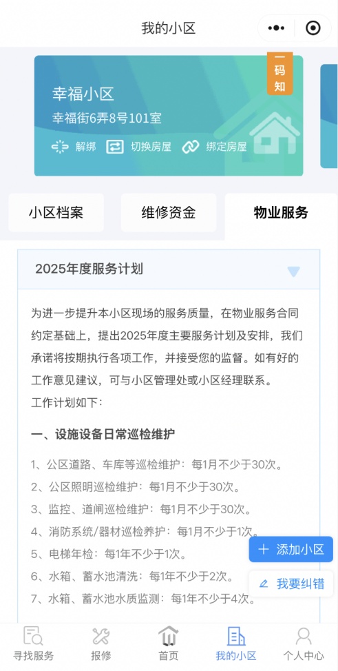 业主绑定住址后,点击“我的小区”→“物业服务”可获知小区物业服务年度计划,主要为设施设备日常巡检维护、清洁卫生、日常巡逻等内容的服务频次以及小区绿化的养护时间。