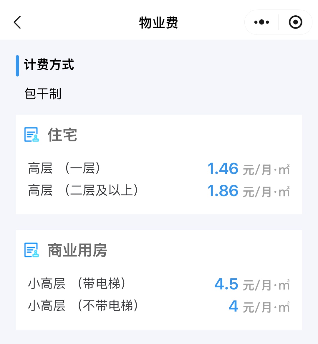 业主可通过小程序首页点击“物业费”查看小区的物业费。