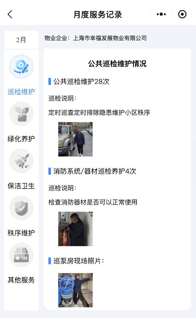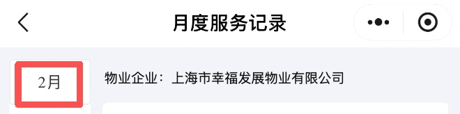业主绑定住址后,点击“我的小区”→“物业服务”可查看小区物业的月度服务实际开展情况,还可根据服务情况进行评分。