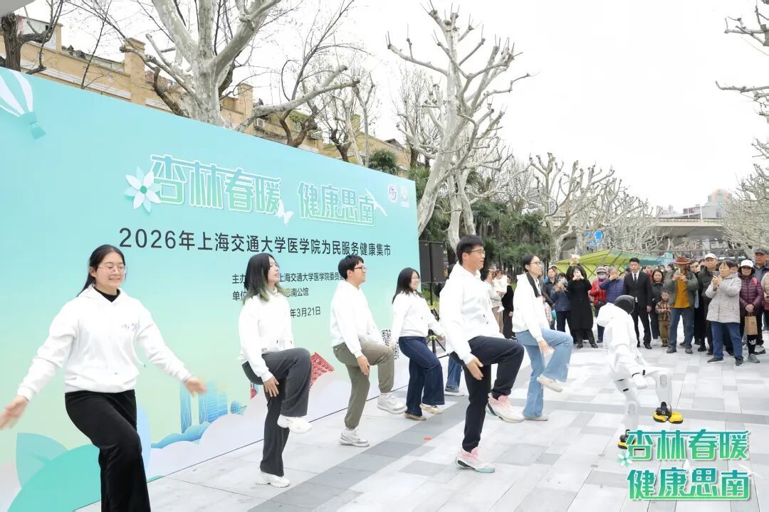仪式开场,一台身着白色卫衣的智能机器人炫酷亮相,带领一群医学生跳起健康操,瞬间点燃现场气氛。这台来自交大医学院附属第九人民医院血管外科“久脉”健康科普项目的“AI私教”,由团队青年自主编写代码、精细调节动作,让AI赋能健康,为科普注入活力。和着欢快的音乐节拍,现场市民跟随着机器人“领操员”也饶有兴致地跃动起来。