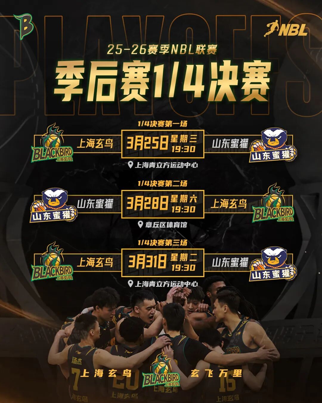 3月21日,2025-2026赛季NBL常规赛全面收官。随着常规赛最终排名尘埃落定,八强战队已经悉数就位,季后赛晋级之路正式开启!上海玄鸟男篮以常规赛第三名的战绩,将在1/4决赛中对阵排名第六的山东蜜獾。首战将于3月25日(周三)19:30率先在玄鸟主场青立方运动中心打响。