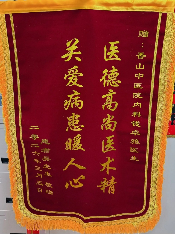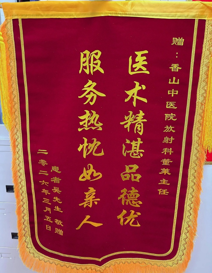 近日,黄浦区香山中医医院放射科主任董莱和西医内科钱卓雅医生共同收到了患者吴先生送来的一面锦旗。锦旗上熠熠生辉的赞誉之词,不仅承载着吴先生对医院医务人员的深厚谢意,更彰显了医院科室在精准诊断、高效协作方面的专业担当。