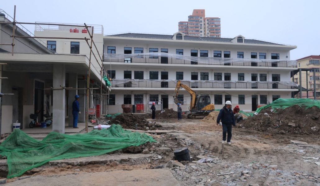 3月24日上午,在敬老院内,挖掘机正在作业,工人们有序推进各项施工。