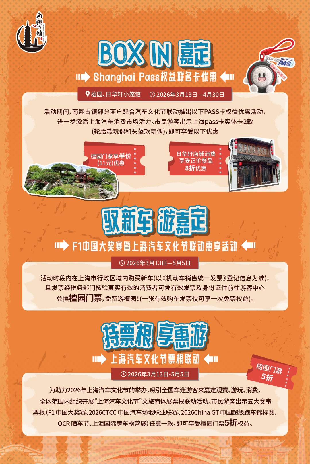 “国风遇上老爷车”主题活动——第二季 春风拂过,古韵悠然 当经典老爷车的金属光泽 映照在南翔古镇的白墙黛瓦间, 一场跨越时空的对话, 即将在上海汽车文化节期间优雅上演。 南翔古镇“国风遇上老爷车”主题活动 快来看看有哪些活动吧! 【时间】:3月27日—3月30日,14:00—20:00 【地点】:南翔古镇游客中心北侧 【时间】:3月28日—3月29日,9:00—20:00(如遇特殊天气情况停止展示) 【地点】: 国潮美学空间门口 【时间】:即日起—3月31日 【地点】:国潮美学空间门口 【投稿邮箱】: laojieban@126.com 【活动细则】:扫描下方二维码获取活动细则 【时间】:3月28日—3月29日,每天15:00、16:00(如遇特殊天气情况停止演出) 【地点】: 国潮美学空间门口 【时间】:即日起—5月30日,14:00—20:00 【地点】:双塔下沉式广场(东塔) 【时间】:即日起—5月5日 【地点】:详见下方海报 这个春天, 来南翔古镇, 让国风与老爷车, 共同为您开启一段穿越时光的浪漫旅程。 通讯员:万玥