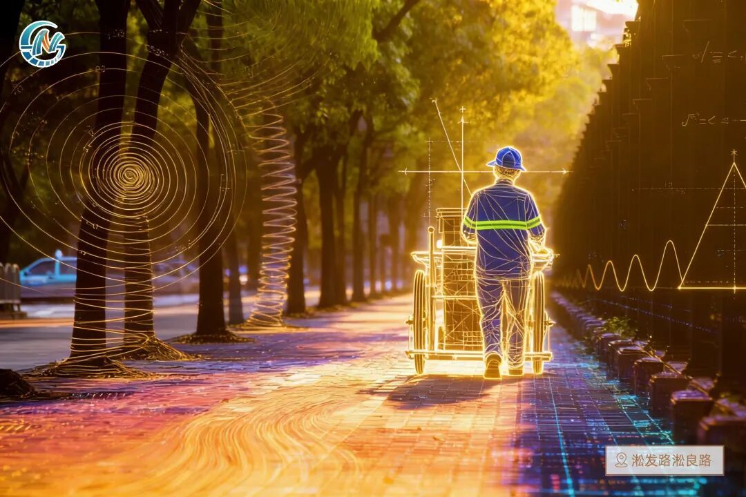 环卫工的身影是晨辉中最早的“解题者”。金色向量线勾勒出坚守的轮廓,函数曲线交织成温暖的剪影,手推车化作坐标轴与参数方程构筑的几何杰作。晨光被量化为渐变的色值数据,每一道等高线都承载着城市洁净的密码,这是正在运行的城市清洁算法,让平凡劳作在数学世界里焕发科技光芒。