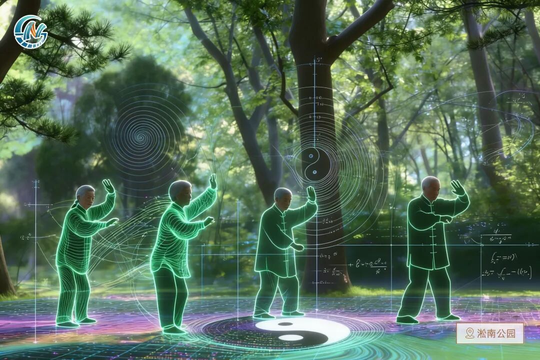 林间晨雾或晚霞中,太极练习者的招式化作松绿向量线与太极曲线的优雅轨迹,每一个动作都成为坐标轴与参数方程构建的动态几何。斑驳光影被量化为渐变的色值数据,这是正在运行的太极养生算法,让传统功法在数学世界里焕发科技质感。