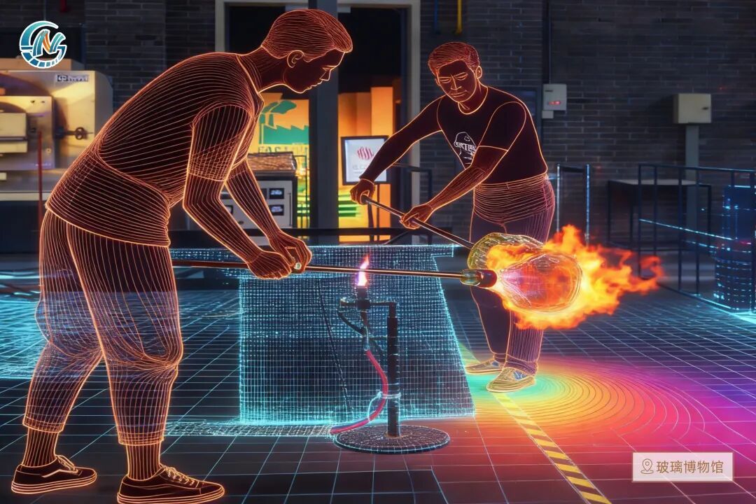玻璃工匠的轮廓由赤铜色的向量线与贝塞尔曲线勾勒而成,手中吹制的熔融玻璃,化作由参数方程驱动的流体几何结构,在热力场中肆意舒展、不断塑形。这是正在运行的玻璃造物算法,让传统匠心在数学解构中,碰撞出科技感与未来感的火花。