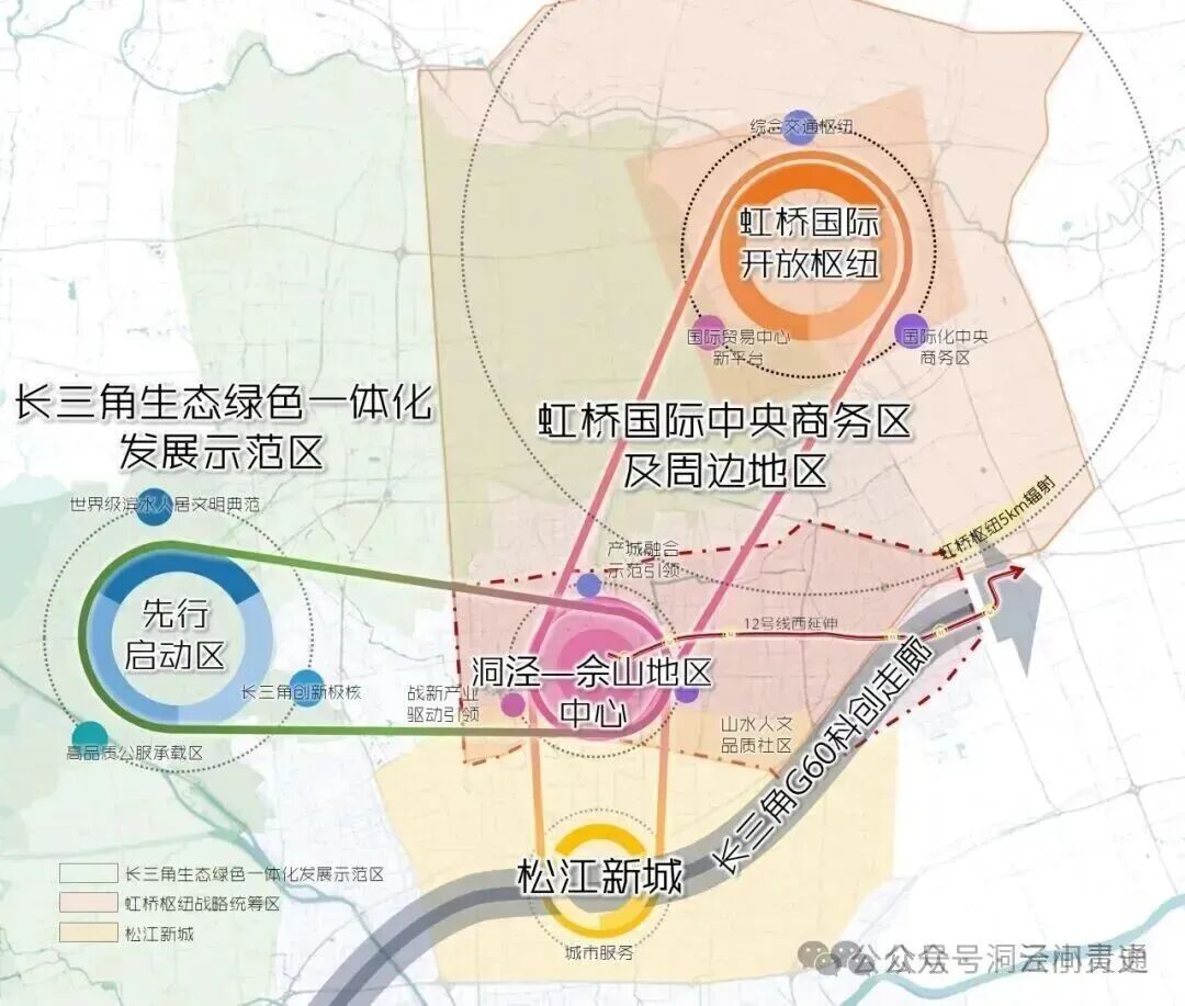 相关方案中,令人印象最深刻的就是对洞泾未来发展愿景的论述。这是一个站位非常高的发展目标。洞泾镇地处“长三角G60科创走廊”“虹桥国际开放枢纽”“长三角生态绿色一体化发展示范区”三大国家战略的交汇点,轨交12号线西延伸工程落地,对整个地区来说,是一个极其重要的战略跳板,承接了两大使命——对外是联动支撑大虹桥,与它形成功能互补;对内是整合引领好“沪松十二坊”区域的发展。