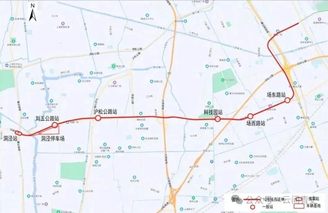 云松小镇(同乐路)站位于沪松公路和沈砖公路交叉口,紧挨“洞泾未来湾”。可以说,这个站点是轨交12号线西延伸段6个站里发展空间最大的一个站,周边可出让地块面积接近1平方千米。“洞泾未来湾”北区引进了华二松江实验学校,2025年9月正式投入使用。沈砖公路南侧以及站点东侧,也分布着一些老工业区和商贸区,这么一看,这里也是一个“新旧冲突”的典型区域。