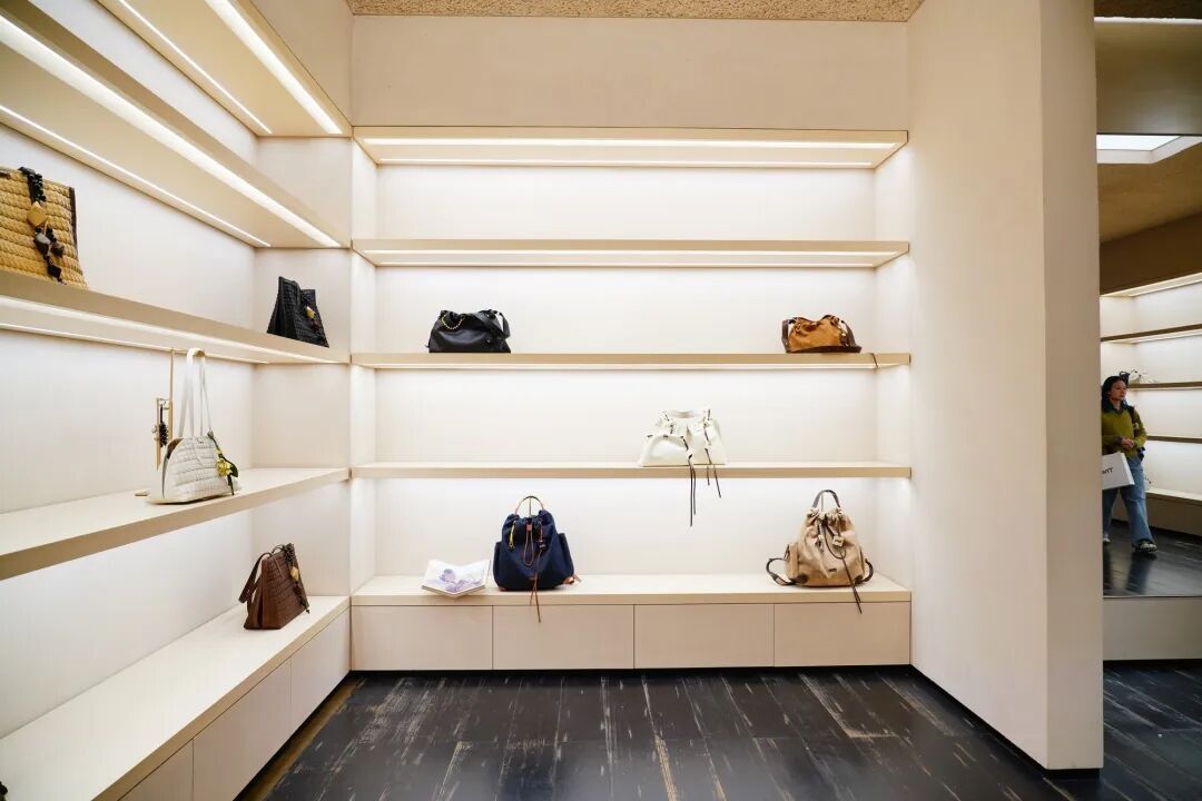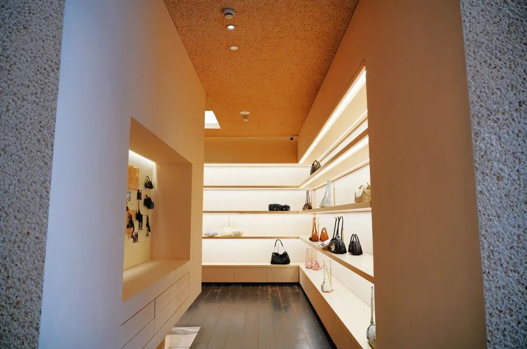 产品陈列的升级,则实现了“品类细分”与“体验优化”的双重突破。扩铺后,品牌将包袋、成衣、香氛三个核心品类进行了清晰的空间划分,根据不同品类的体验需求配置相应的功能——成衣区域配备了更完整的试衣间与试衣镜,满足消费者的试穿需求;香氛区域则营造了静谧的氛围,让人们能够停下来慢慢感受气味的变化。