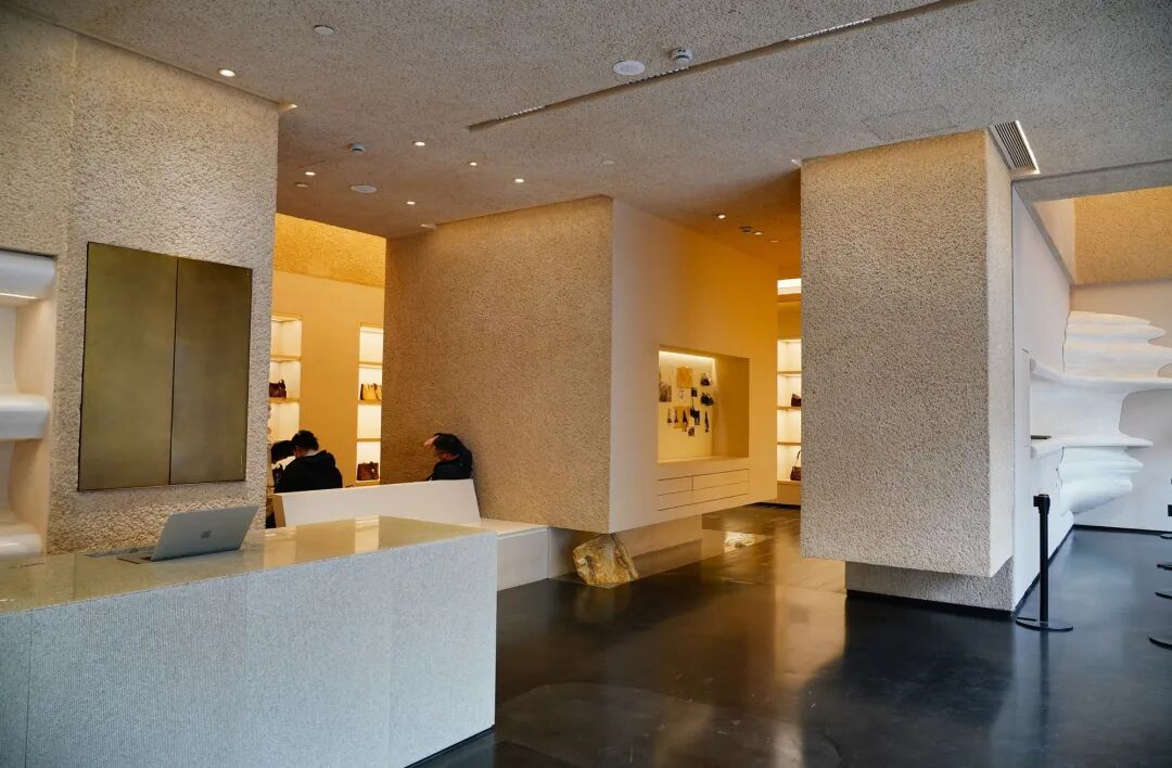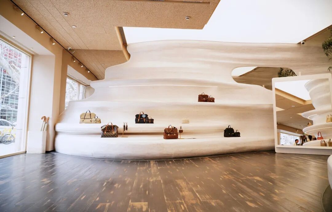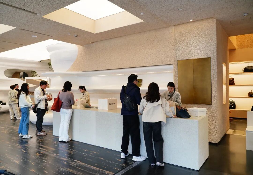 扩铺后的门店,最直观的变化是空间布局的优化,核心是“让体验回归从容”。针对过往高峰时段的排队问题,品牌主动让渡部分陈列面积,增设了休息等候区,配备了可加热的座椅、暖手设备、温水,甚至考虑到季节需求,提前准备了夏季使用的制冰机。这种细节化的配置,打破了传统奢侈品门店“高冷疏离”的刻板印象,让商业空间多了几分人文色彩——这正是山下有松所追求的“包中有温度”。