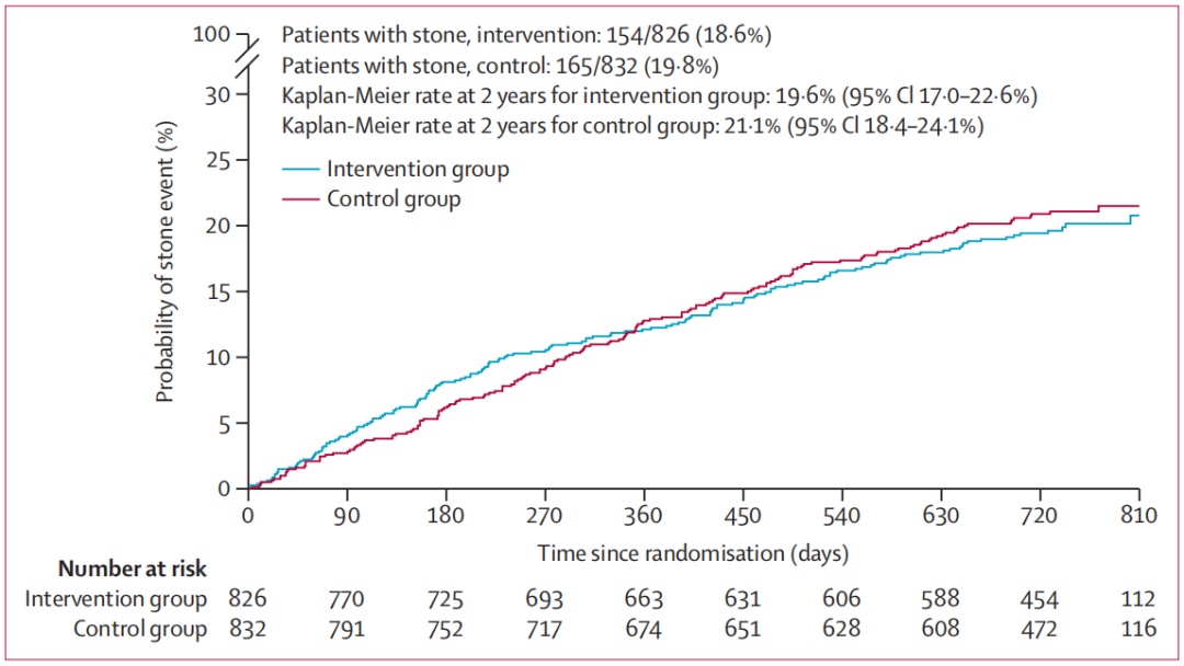 但最关键的核心结果,却打破了传统认知:干预组症状性结石复发率为18.6%(154人),对照组19.8%(165人),两组无统计学差异。简单来说,就算成功让患者多喝了水、尿量变多,但结石复发的概率并没有降低。