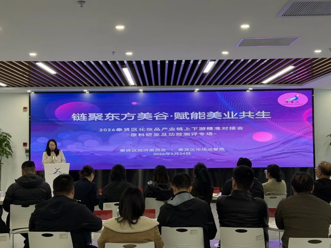 一些茶点,几页PPT,三五家企业代表围坐一桌,聊的不是泛泛的行业趋势,而是具体的原料参数、测评标准和合作意向。3月24日,在南上海科创中心,2026年奉贤区化妆品产业链上下游精准对接会(原料研发及功效测评专场)以这样一种“轻量化”的方式开场。