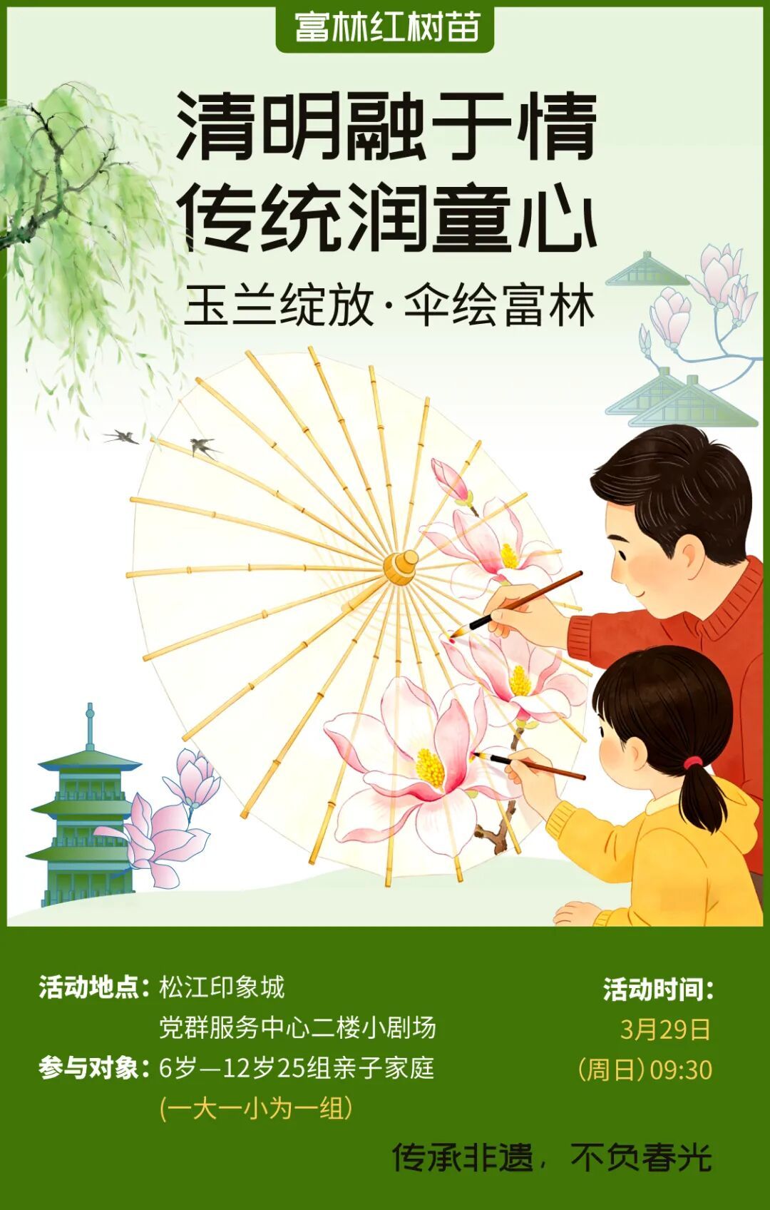 春风拂过广富林的千年文脉,清明时节雨润江南。以上海市花白玉兰为创意灵感,以非遗油纸伞为创作载体,在“上海之根”的文化底蕴里,把清明踏青、插柳祈福、慎终追远的传统习俗,画进一把伞、一段亲子时光。这个清明,与家人共赴广富林,以玉兰为笔、以油纸为卷,把传统之美、城市之魂、亲子之爱,一同收进这把独一无二的手绘伞中。活动时间3月29日(周日)09:30活动地点松江印象城党群服务中心二楼小剧场参与对象6岁至12岁25组亲子家庭(一大一小为一组)报名方式扫码报名