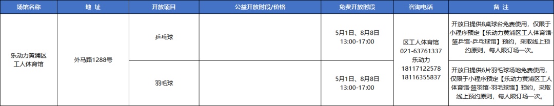 (二)黄浦区总工会公共体育场馆公益开放一览表