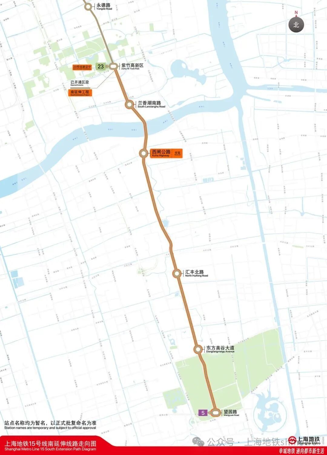 15号线南延伸工程途经奉贤区和闵行区,线路南起奉贤区望园路站,北止于已运营的15号线紫竹高新区站,全长约10.26km,设车站4座,其中兰香湖南路站(紫光路站)位于闵行区内。