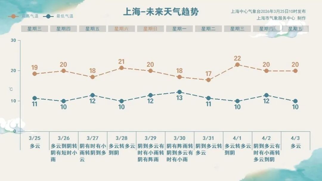 今天(3月25日)申城阳光上线,早间大部分地区最低气温在8~11℃之间,白天升温明显,全天在11~19℃之间。今日风向由北到西北风转为东北到东风,风力不大,相对湿度90%~50%。