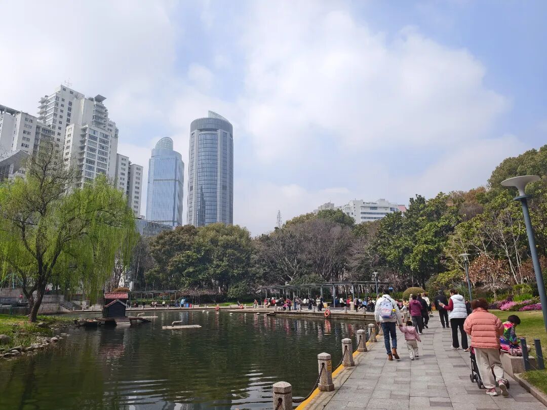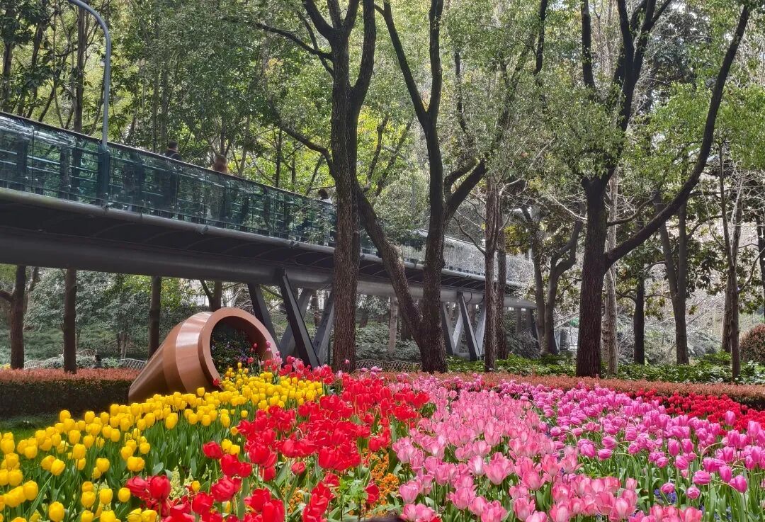 上午十点,许多市民趁着春日晴光来到徐家汇公园赏花游玩。公园内各色郁金香正值盛花期,缤纷的花朵吸引游客驻足观赏。汇金湖畔,不少家长带着孩子散步,阳光洒在湖面,波光粼粼,一派悠然惬意的景象。