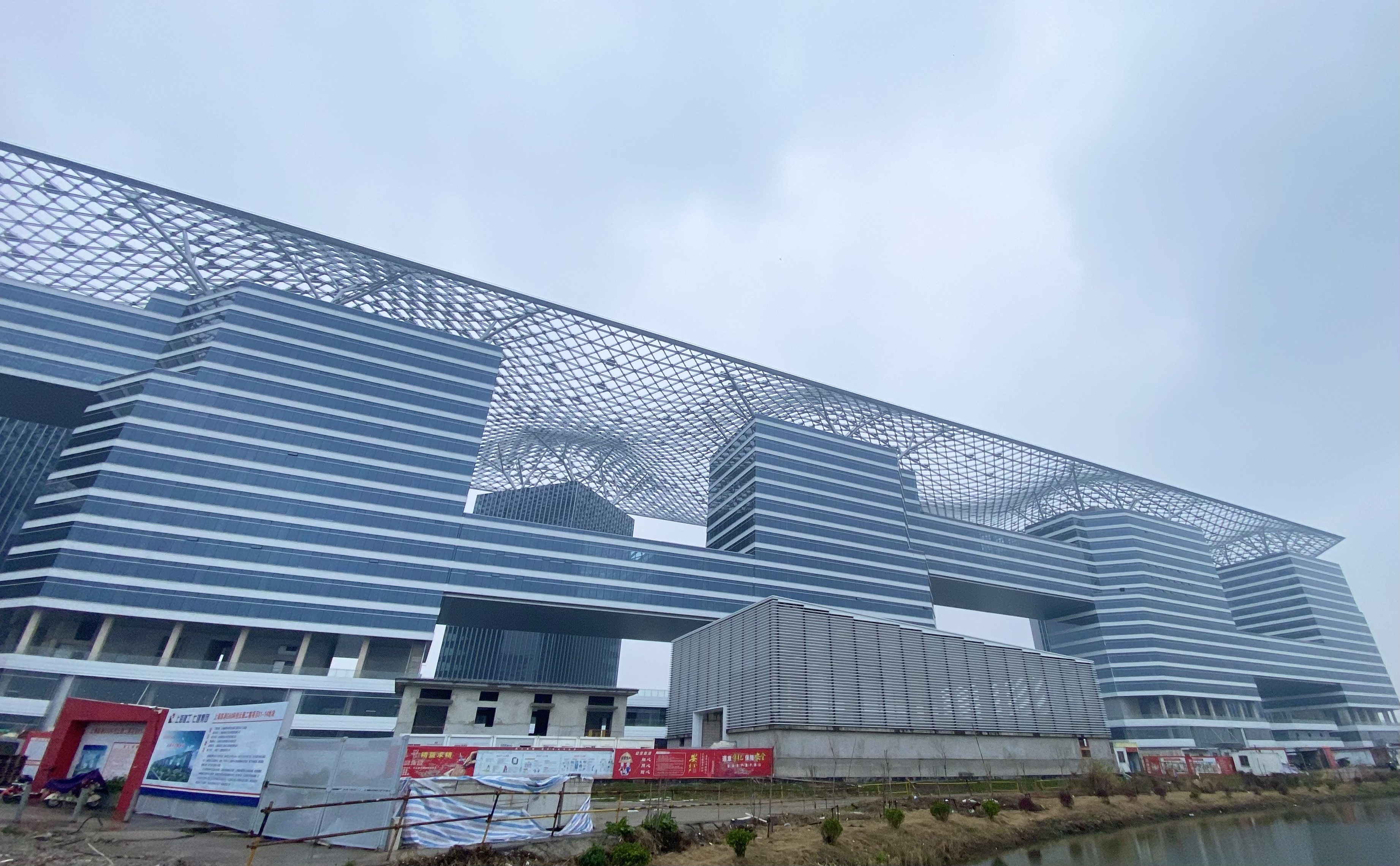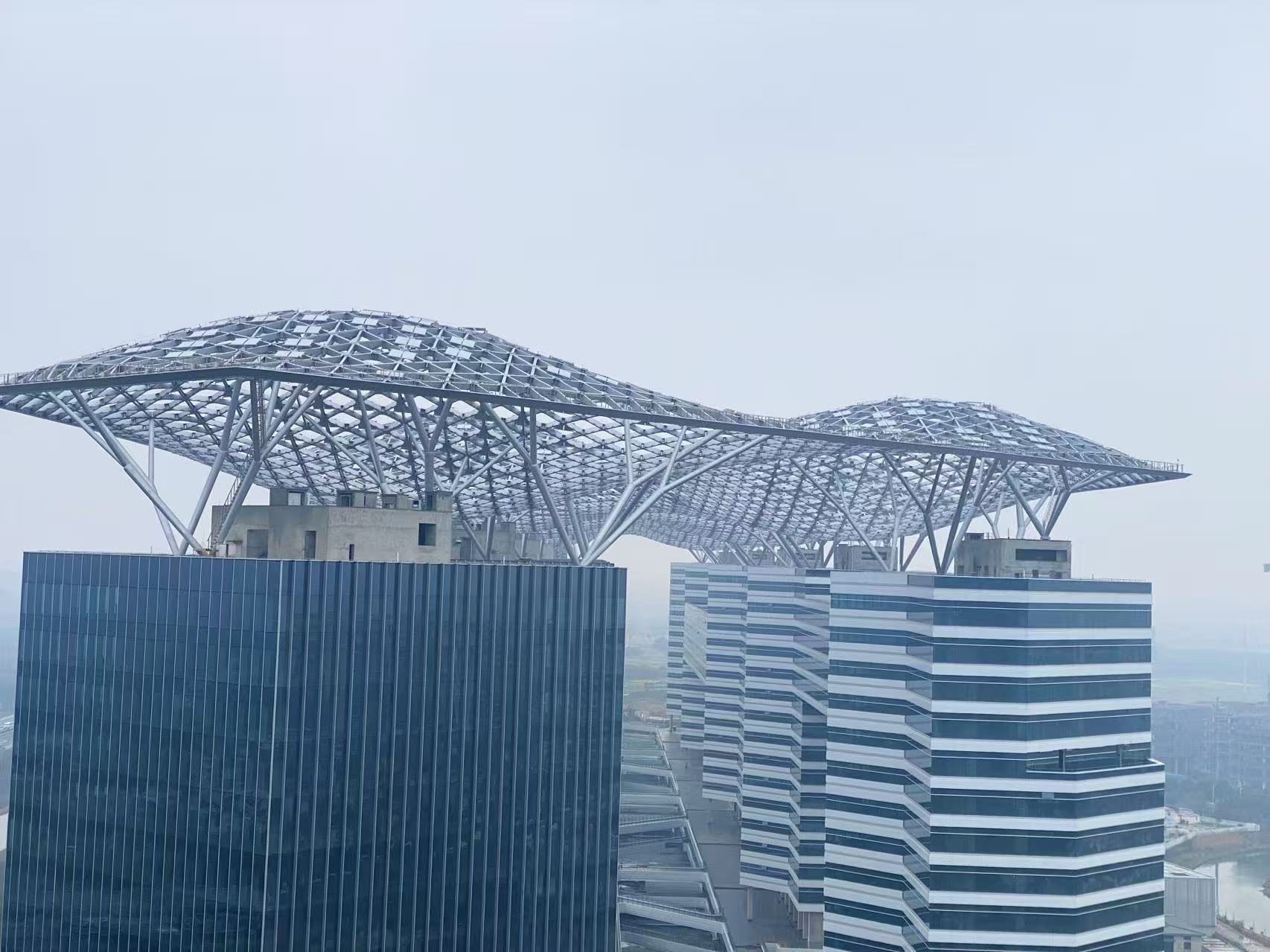 记者在建设现场看到,如波浪般起伏的银色网状屋盖横跨于22栋高楼之巅,其下,二期项目总面积达25万平方米的玻璃幕墙已安装完毕,超过11万盏泛光灯具如星辰般密布于建筑立面。