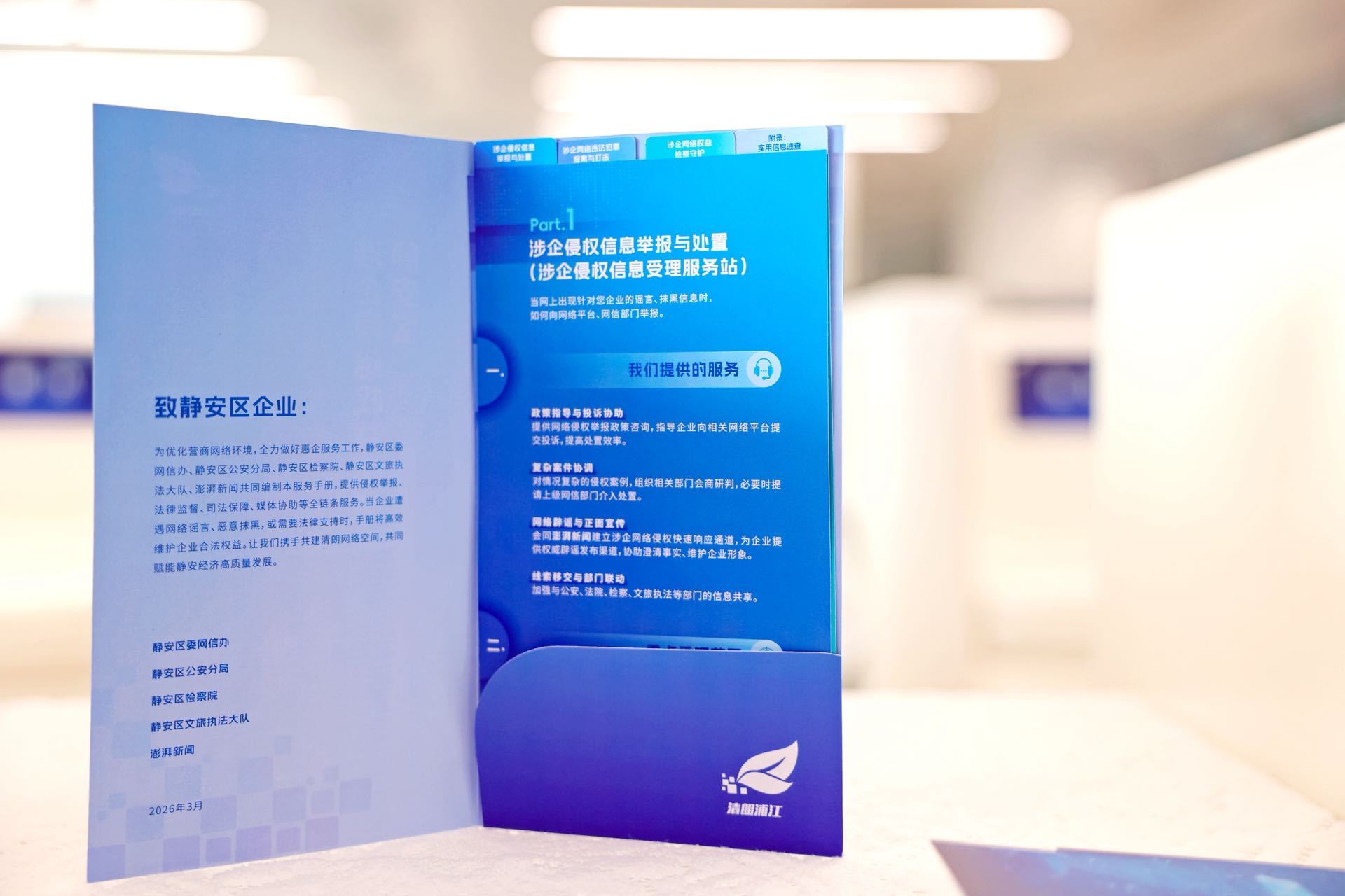 参加活动的企业代表们还当场收到《静安区涉企网络权益保护服务手册》。这本手册汇编了各个站点职能、服务流程、联系方式等内容,将成为企业在网络空间维权的“口袋宝典”。