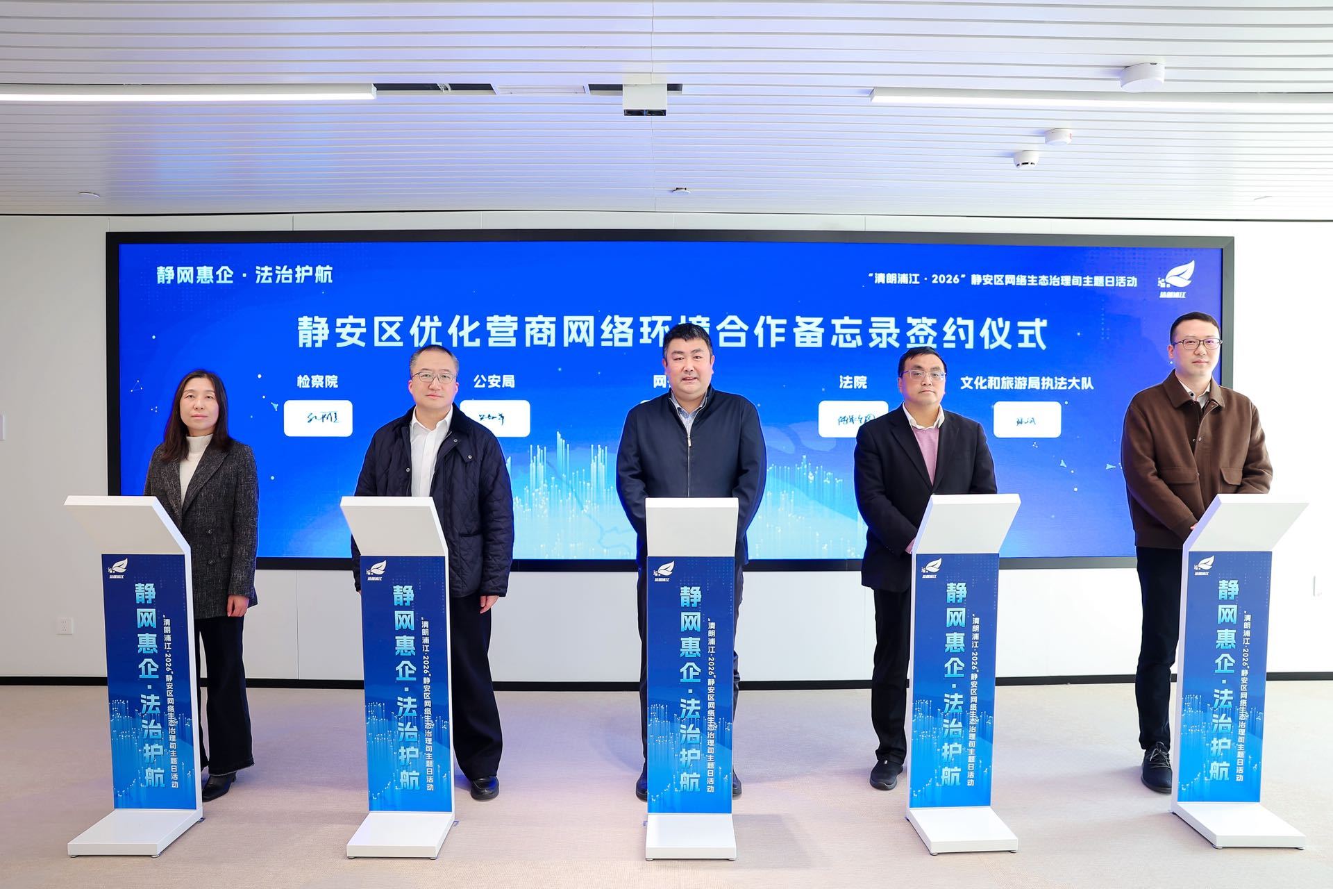 活动现场,区委网信办、区公安分局、区法院、区检察院、区文化旅游局执法大队共同签署《静安区优化营商网络环境合作备忘录》,明确各方职责分工、线索移送、联合处置等协同机制,为后续工作提供制度保障。这也标志着静安区涉企网络权益协同保护机制正式建立。