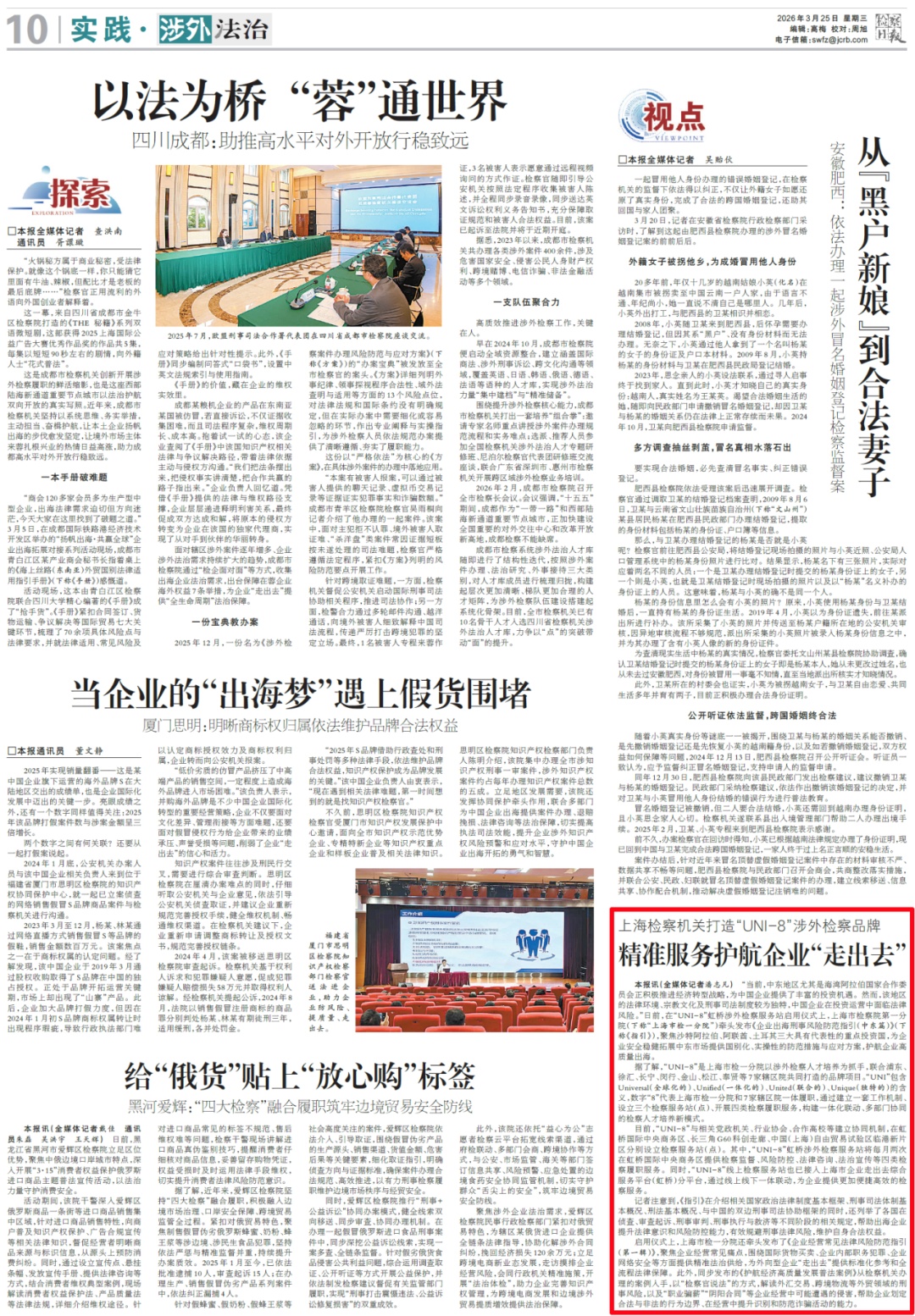 启用仪式上,上海市检一分院还牵头发布了《企业经营常见法律风险防范指引(第一辑)》,聚焦企业经营常见痛点,围绕国际货物买卖、企业内部职务犯罪、企业网络安全等方面提供精准法治供给,为外向型企业“走出去”提供标准化参考和全流程法律保障。此外,同步发布的《护航经济高质量发展普法案例》从检察机关办理的案例入手,以“检察官说法”的方式,解读外汇交易、跨境物流等外贸领域的刑事风险,以及“职业骗薪”“阴阳合同”等企业经营中可能遭遇的侵害,帮助企业划定合法与非法的行为边界、在经营中提升识别和防范诈骗活动的能力。