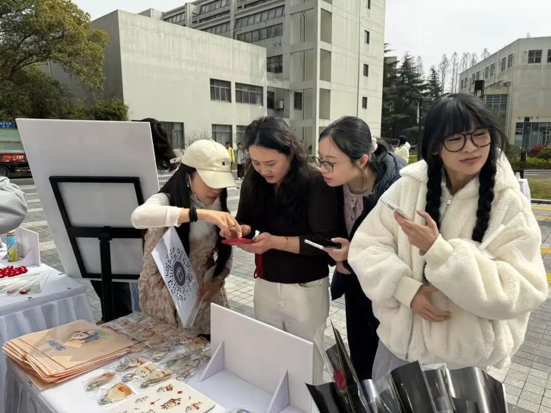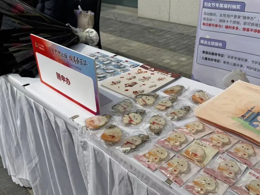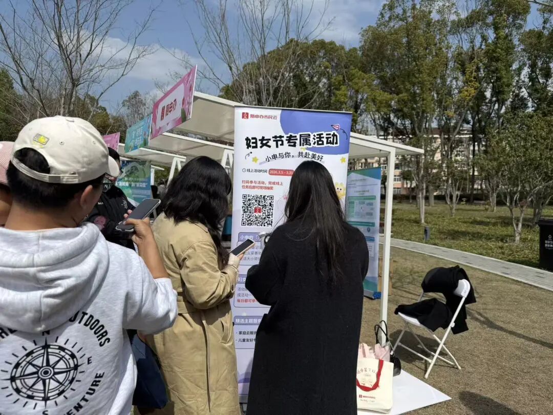 最热闹的当属抽奖环节。摊位前,许多女性市民们前来参与活动。工作人员耐心指引她们通过手机参与线上“三八妇女节主题活动”,凭截图即可在线下摊位参与抽奖。小申定制帆布袋、徽章、冰箱贴等文创周边一一送出。