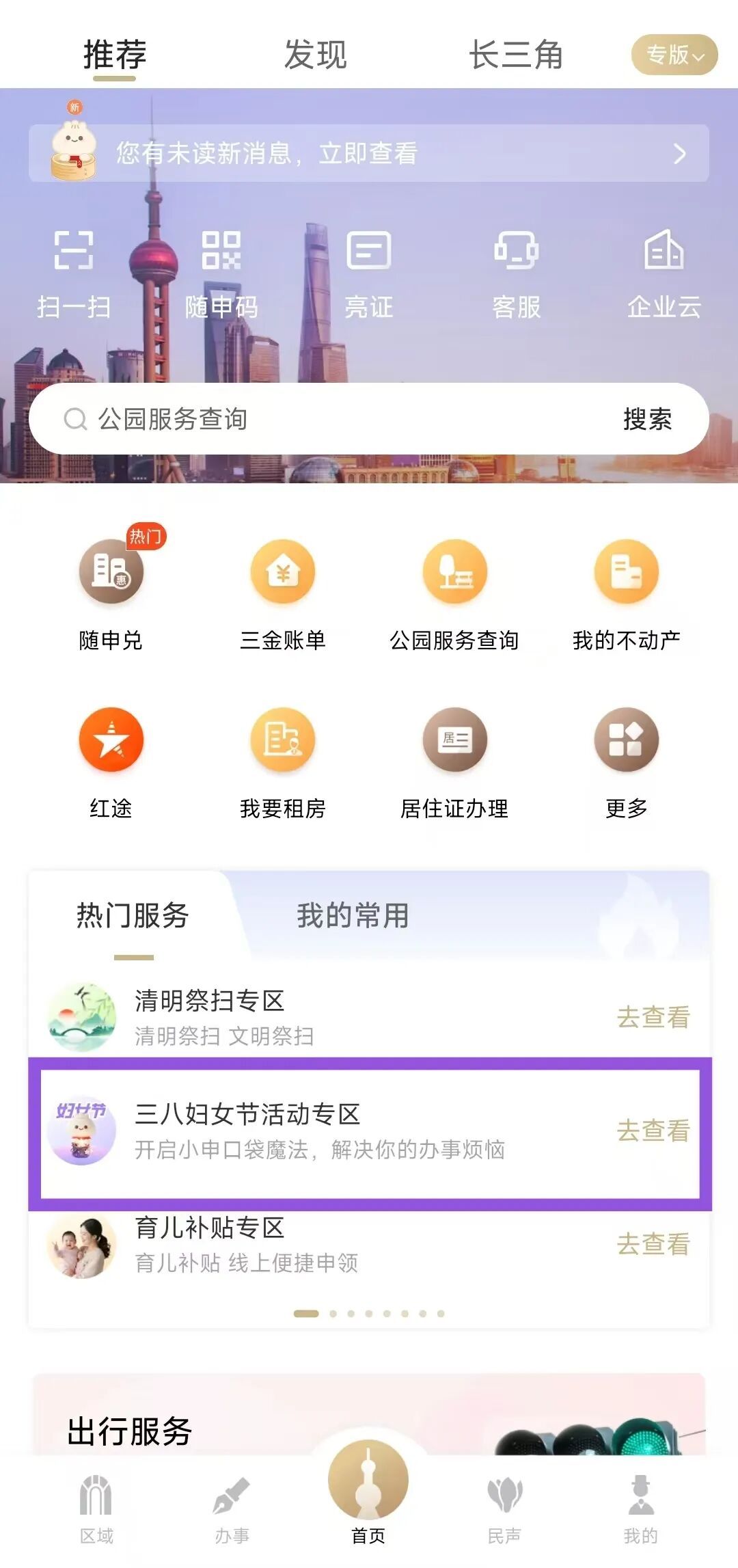 打开“随申办市民云”(APP/微信小程序/支付宝小程序),首页点击“三八妇女节活动”图标即可快速进入,也可以在首页搜索栏搜索“三八妇女节活动”点击选项进入。