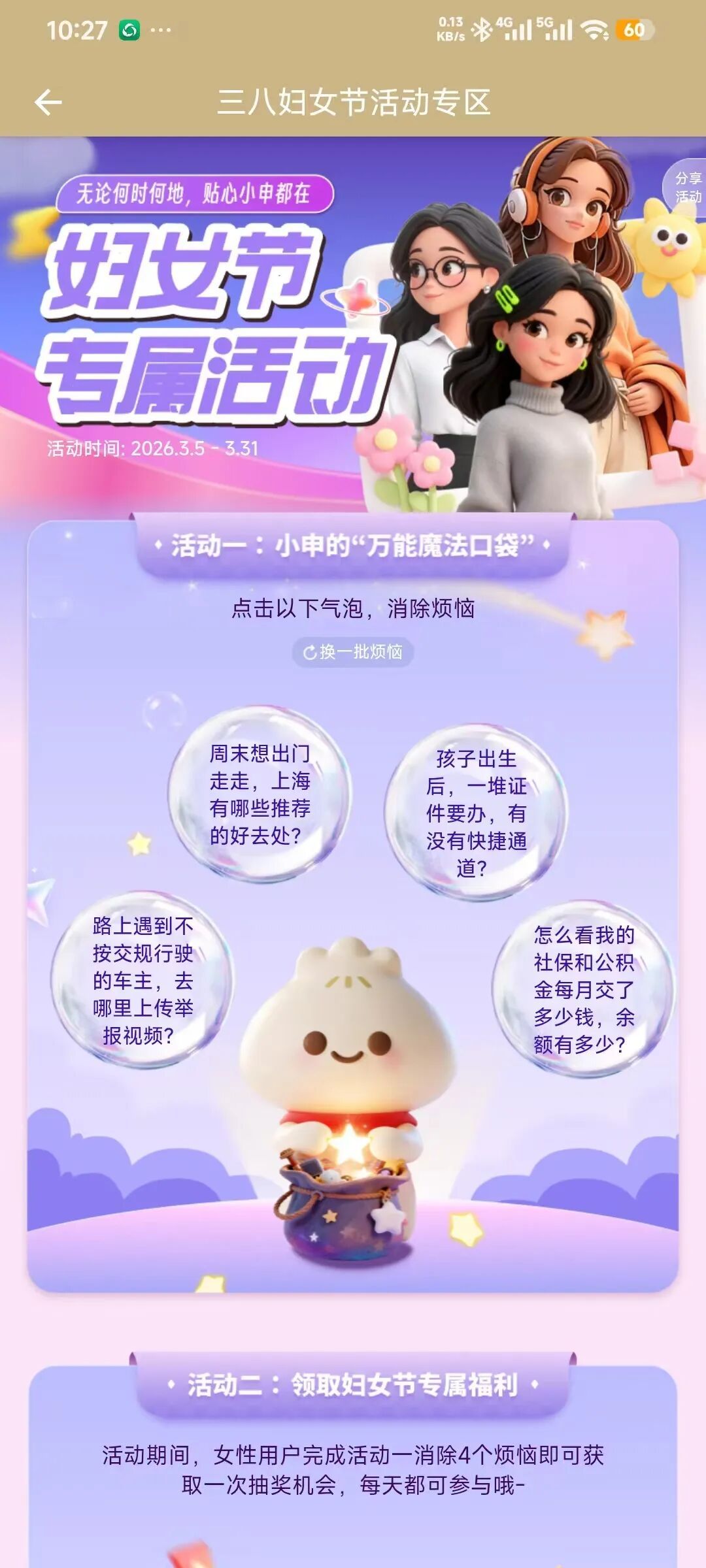 用户只需依次点击并成功访问4个推荐服务,当所有烦恼气泡都查看过后,便能获得一次抽奖机会,赢取小申周边好礼。每日可参与一次,活动持续整个三月。