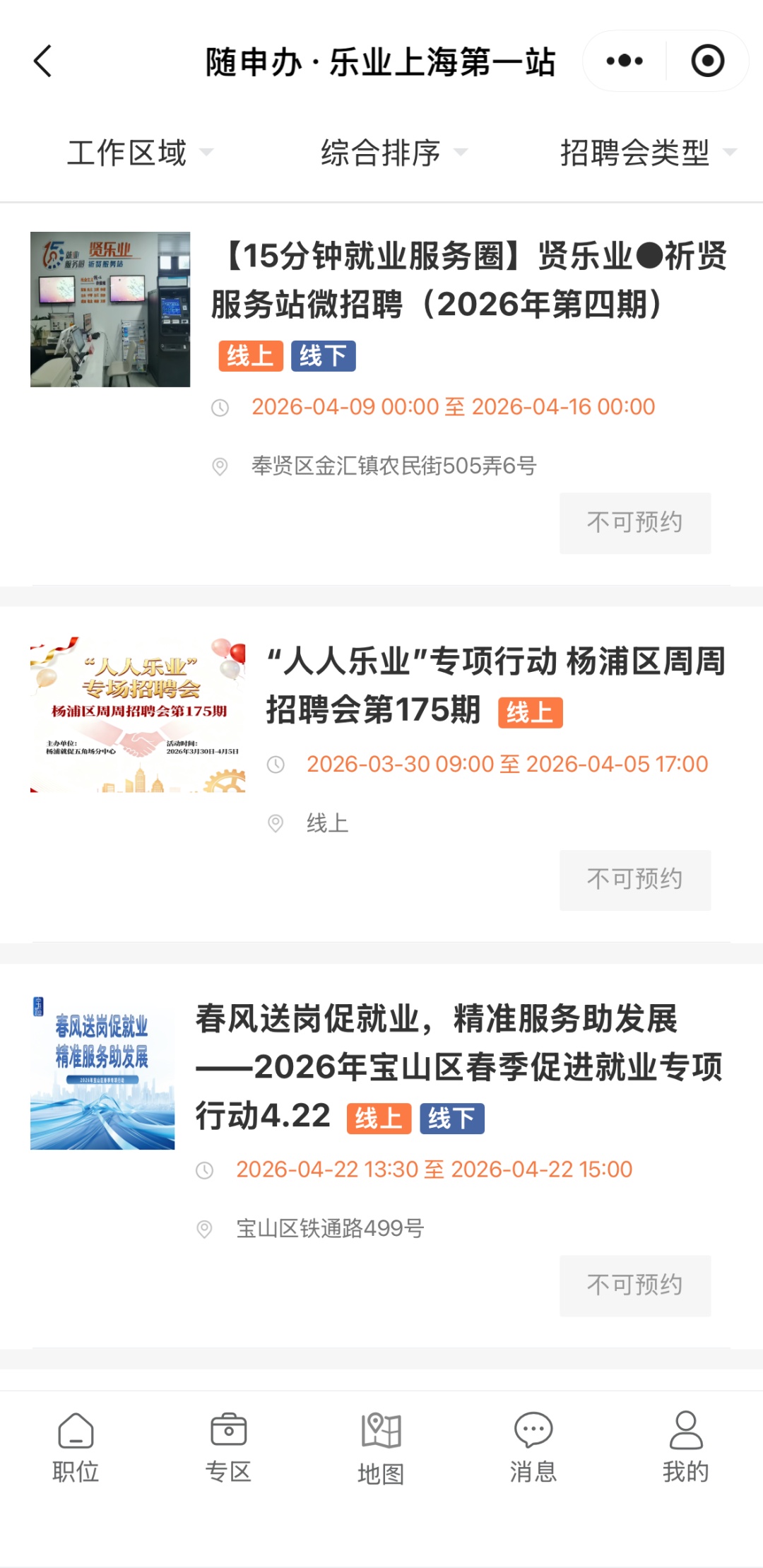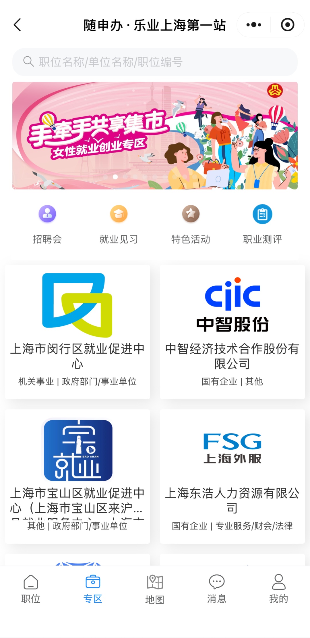 在“随申办·乐业上海第一站”专区内,点击“专区”,可进一步获取招聘会、就业见习、专项职业指导等相关信息,解锁更多就业机会!
