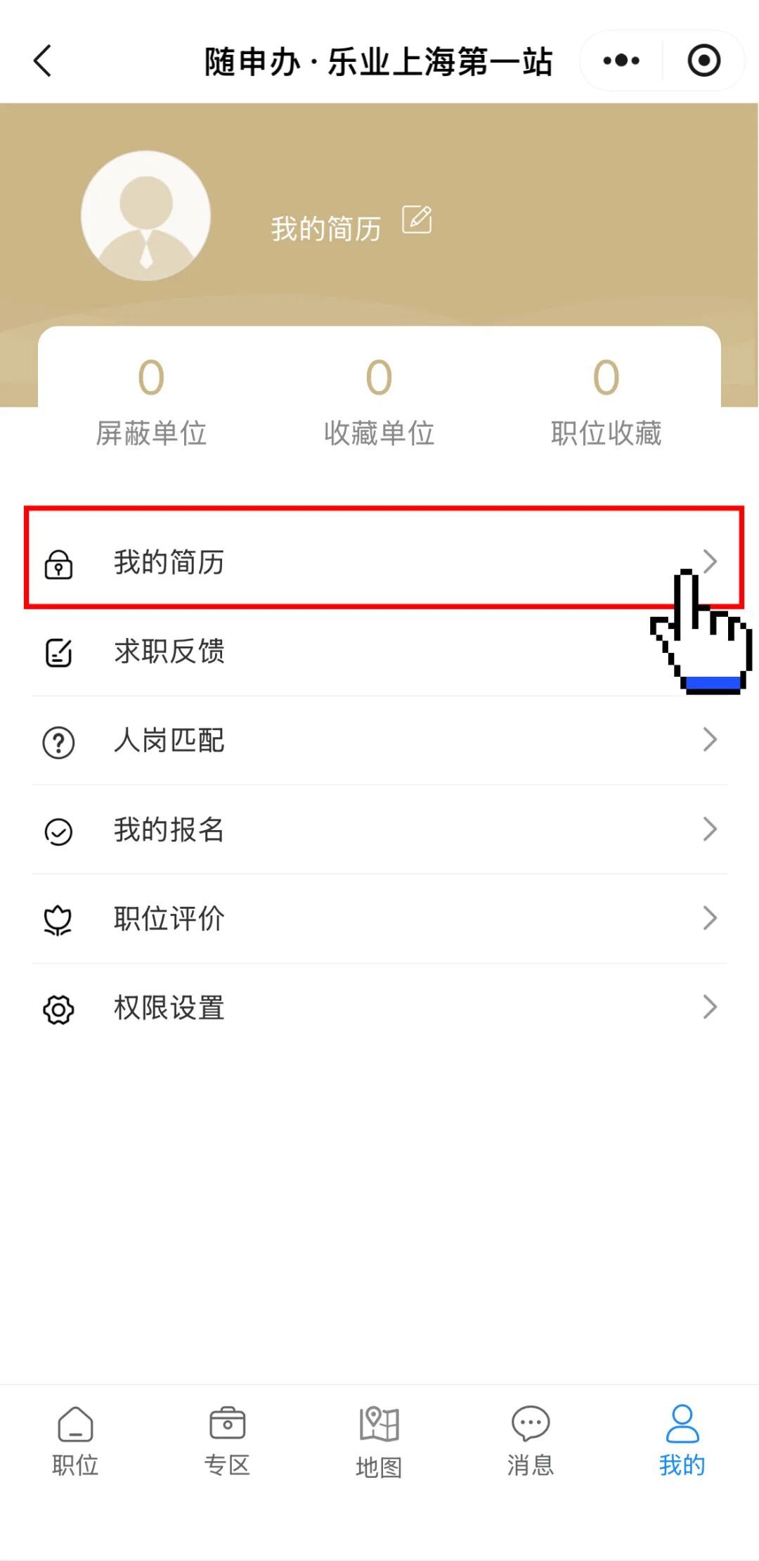 在“随申办·乐业上海第一站”专区内,点击“我的”,选择“我的简历”,即可在线维护个人简历。