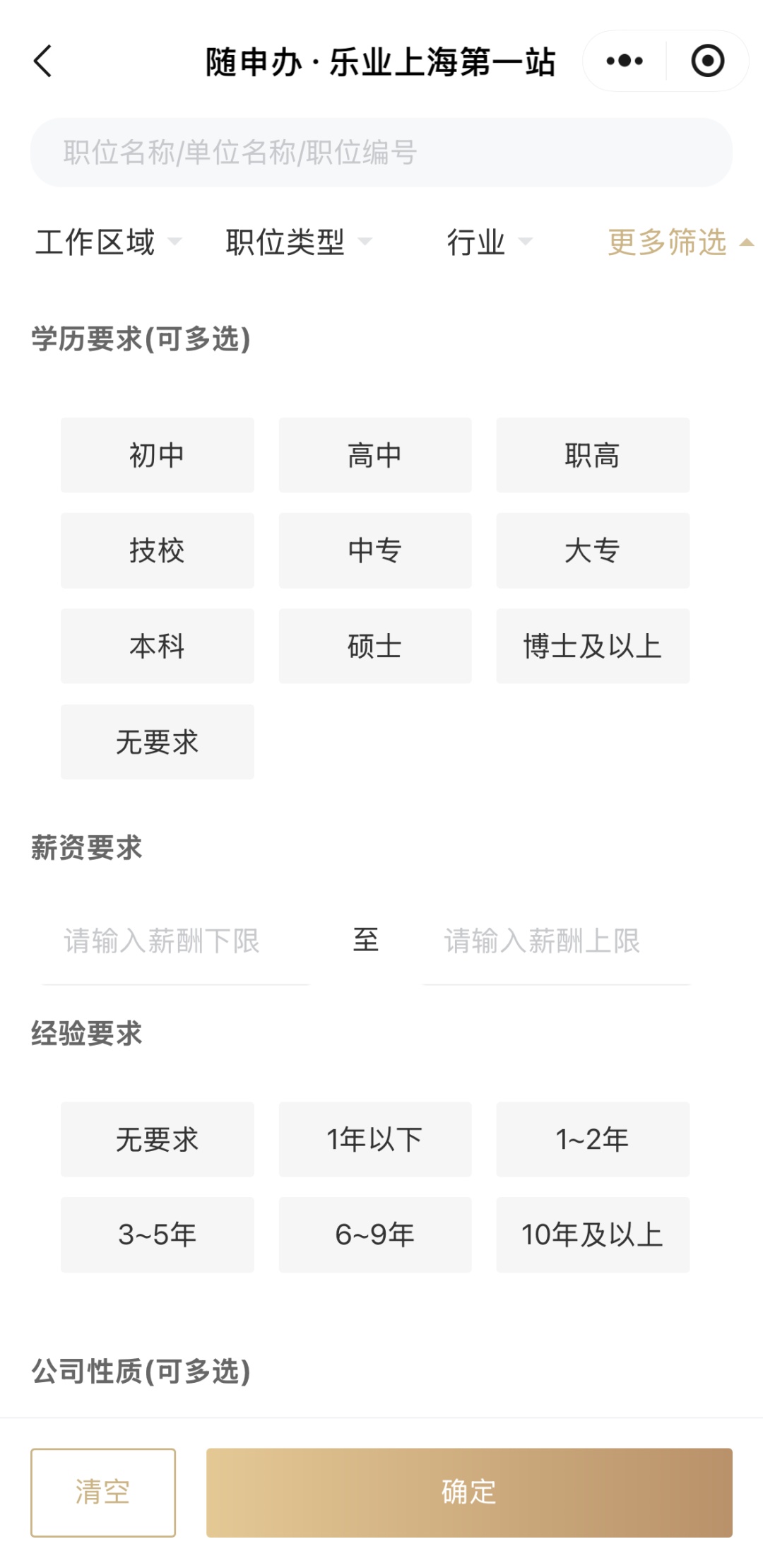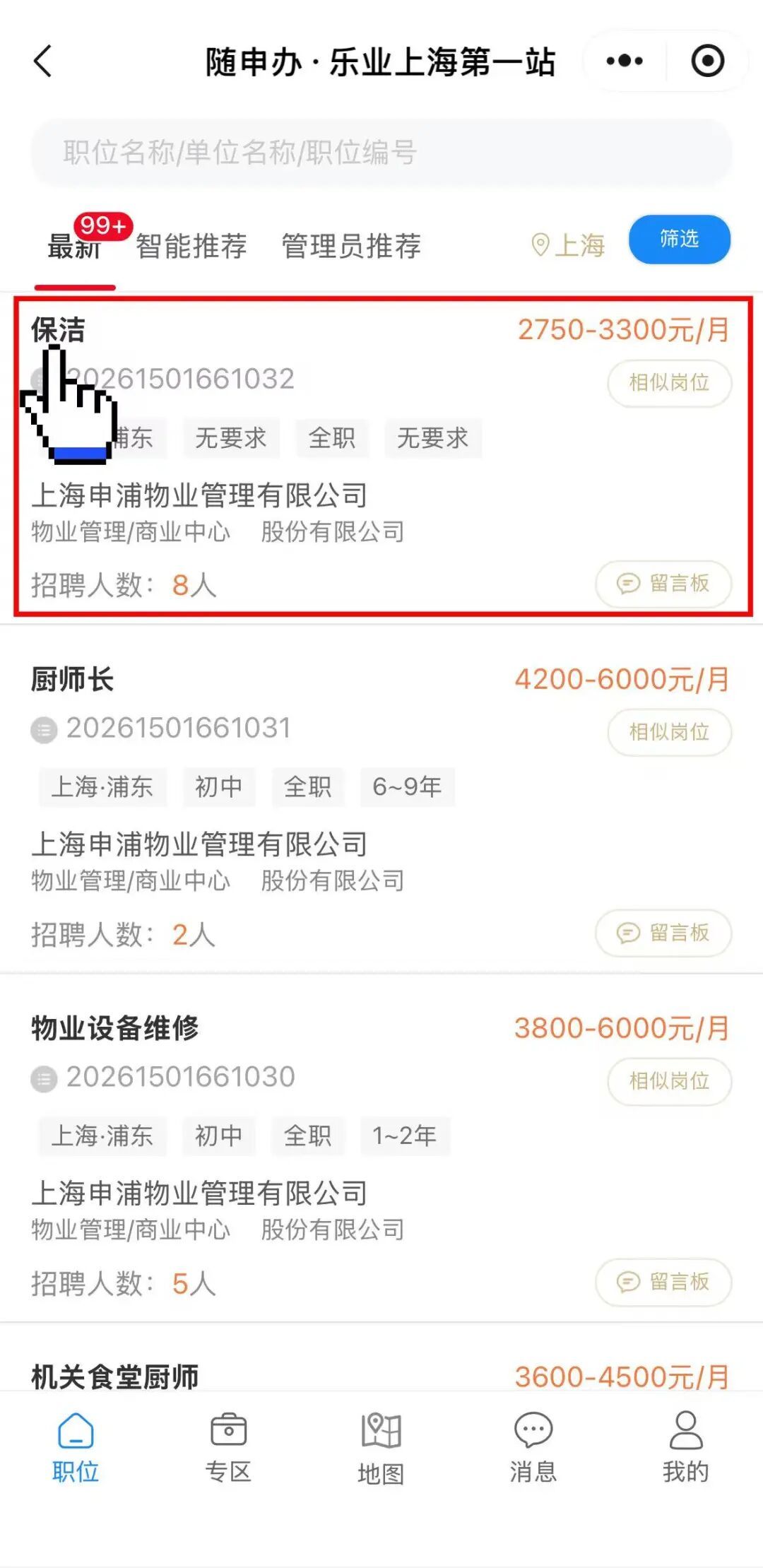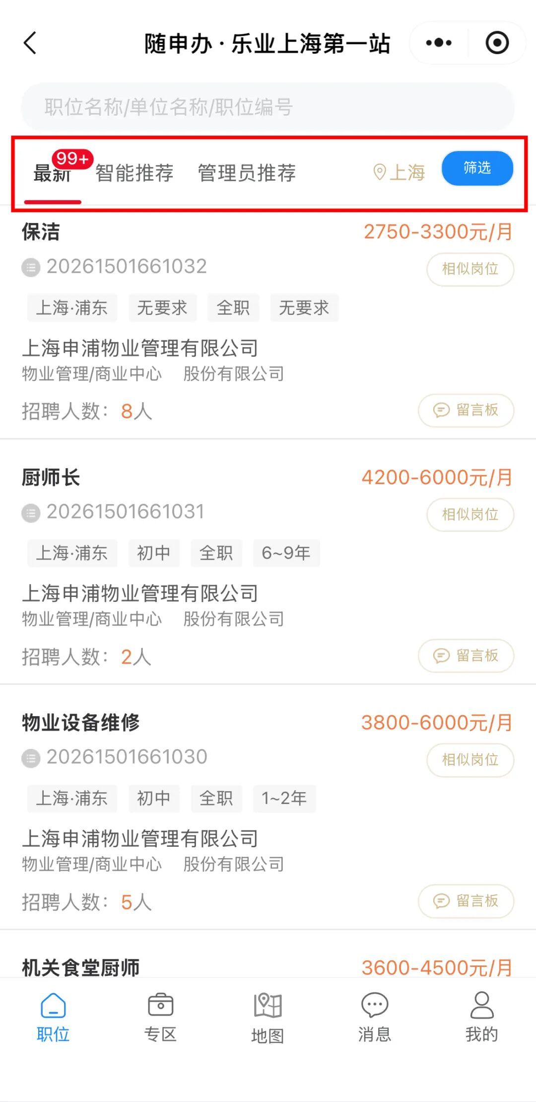 在“随申办·乐业上海第一站”专区内,点击“职位”,菜单栏可一键查看最新和智能推荐岗位。还可点击右上角“筛选”按钮,可按“工作区域”“职业类型”“行业”等标签查找心仪的岗位信息。