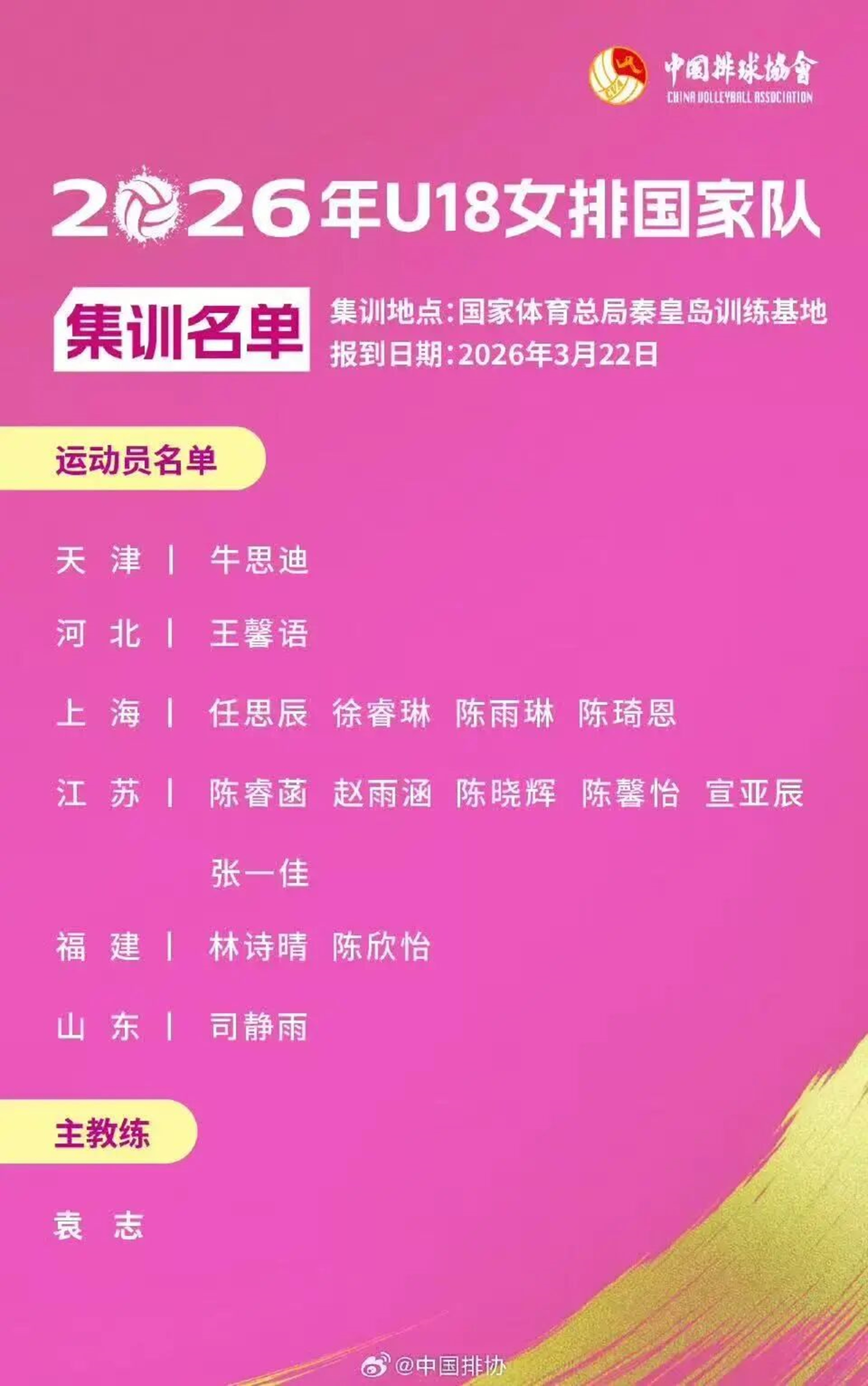 近日,2026年U17、U18女排国家队在秦皇岛训练基地正式开启集训。集训名单中,入选的8名上海运动员里有5人由上海市黄浦区黄浦少体校培养输送,她们分别是:U17女排的宋子苧、文思瑞;U18女排的任思辰、徐睿琳、陈琦恩。