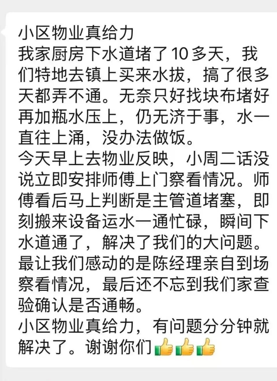 事后,王阿姨专门通过微信表达对物业的感谢:“我家堵了十多天的厨房下水道,没多久就帮我们解决了,小区物业真‘给力’,有问题分分钟就解决了,谢谢你们!”