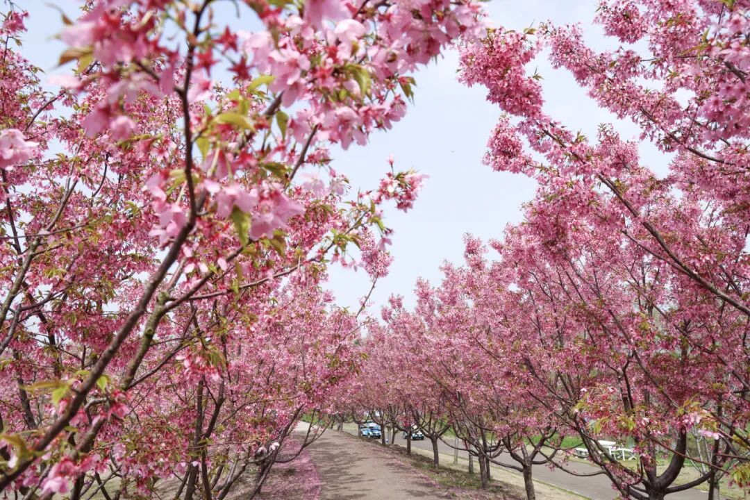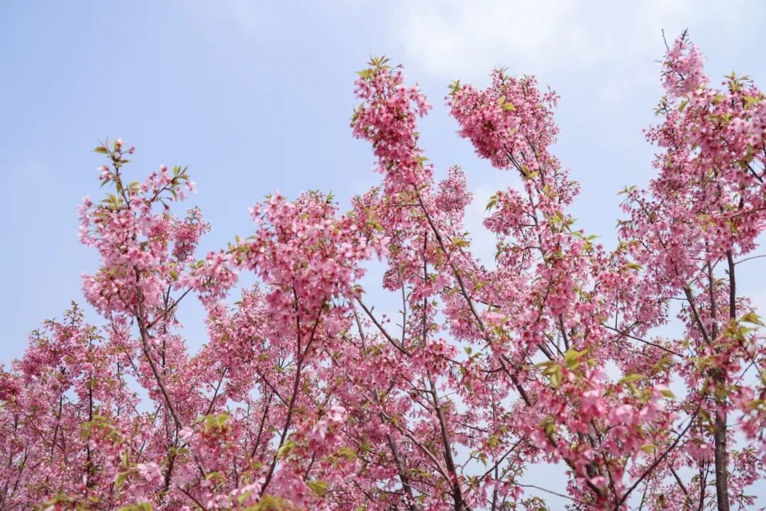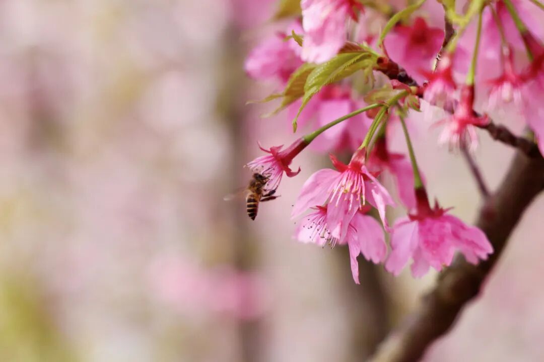 在花开海上生态园的芳香花园内,蜿蜒的步道两侧,红粉佳人樱悄然盛放,粉白相间的花瓣缀满枝头。微风拂过,花瓣随风轻舞、簌簌飘落,成群的小蜜蜂在花丛中穿梭采蜜,处处透着生机与活力。