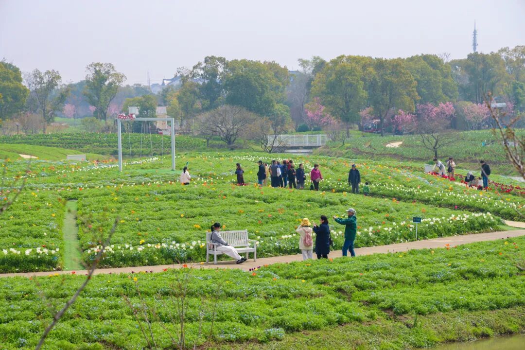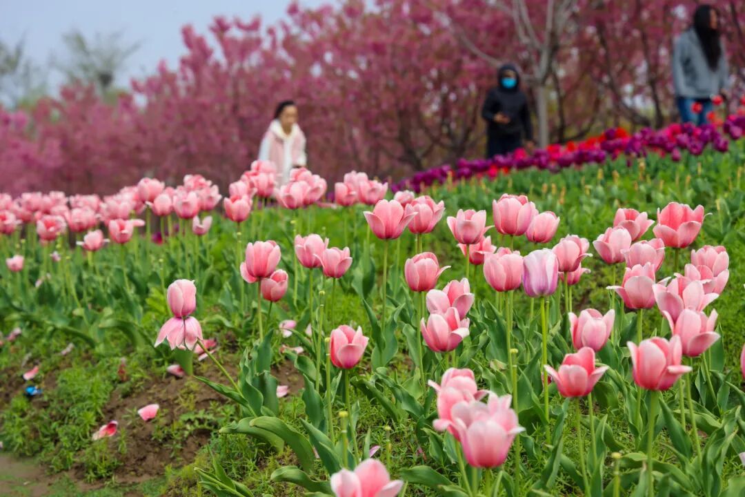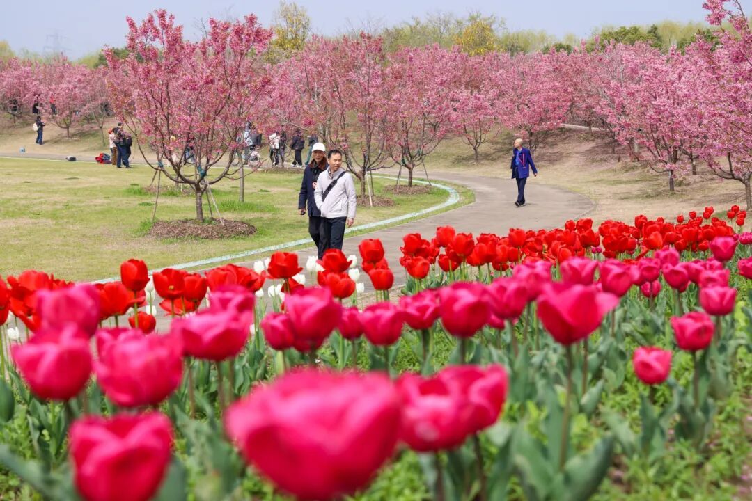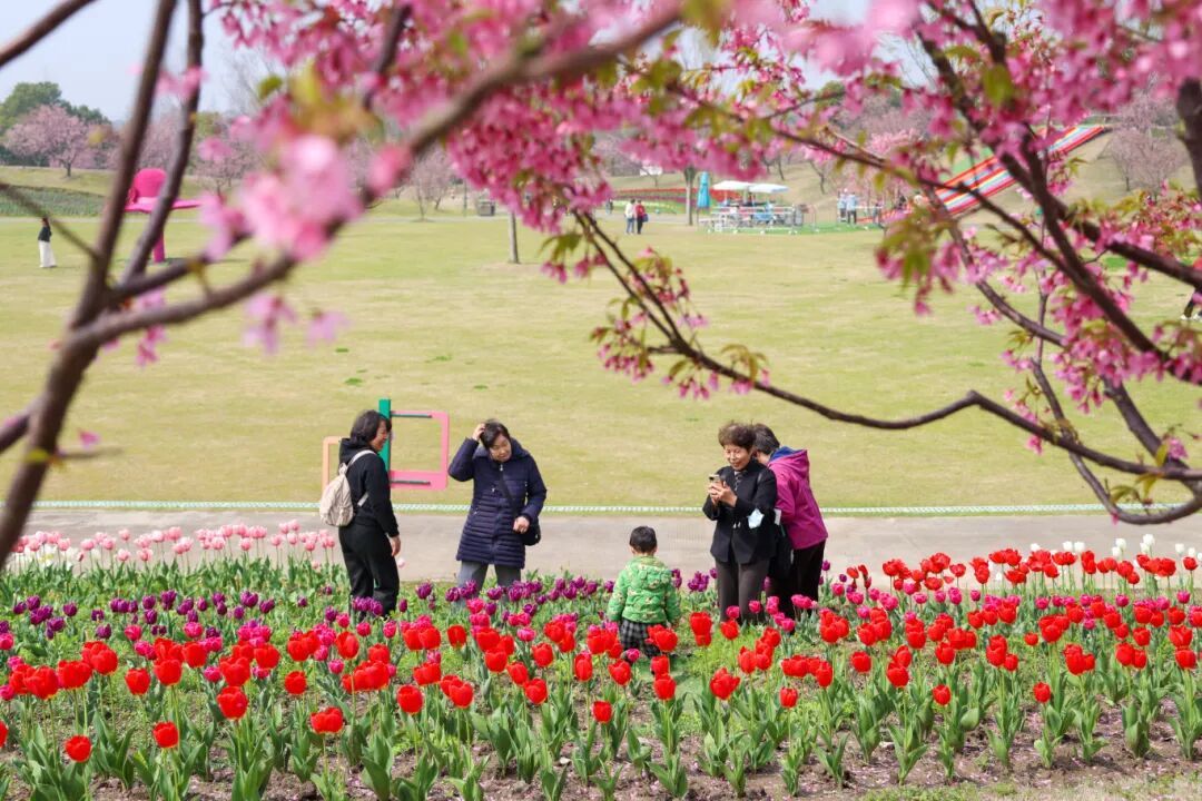 樱花丛旁,郁金香迎风绽放,色彩艳丽、形态饱满,与樱花交相辉映,构成了一幅绝美春日图景,不少市民驻足其间,拍照打卡,定格这份春日美好。