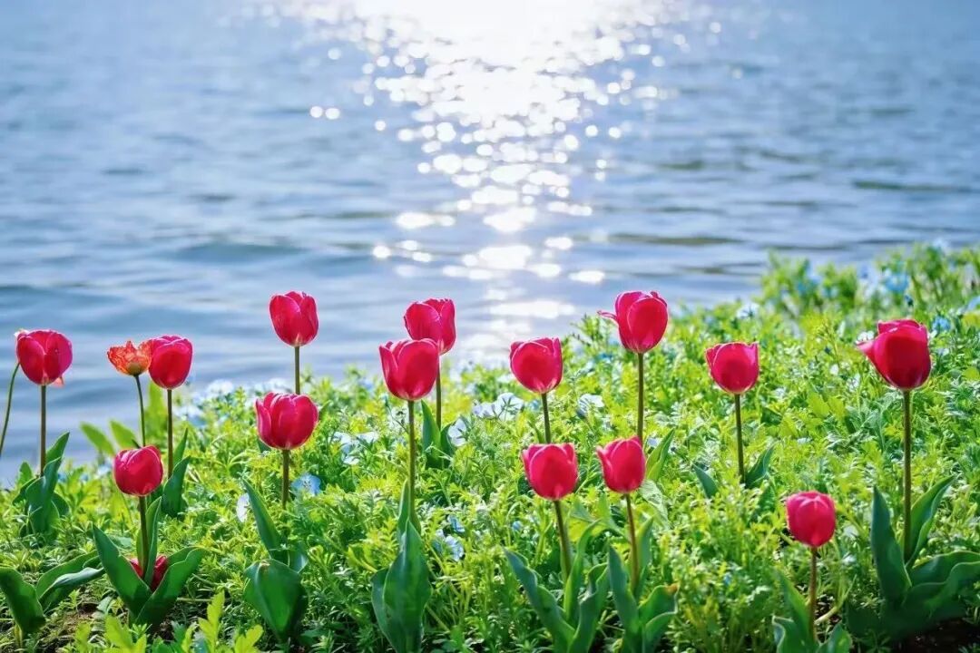 隔水相望的四叶草花海区域,喜林草也在陆续绽放,目前开放度约10%。成片的喜林草铺成蓝色花海,星星点点、如梦似幻,其间点缀着盛放的郁金香、虞美人,层次丰富、景致动人。