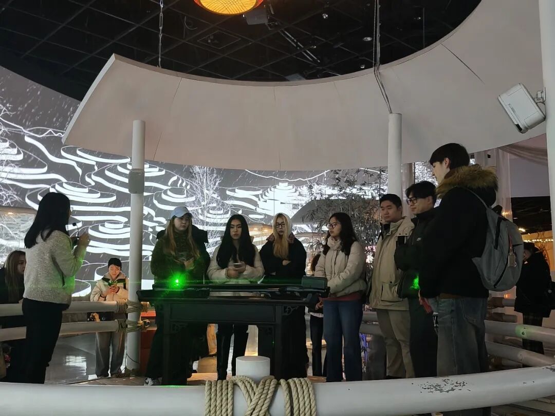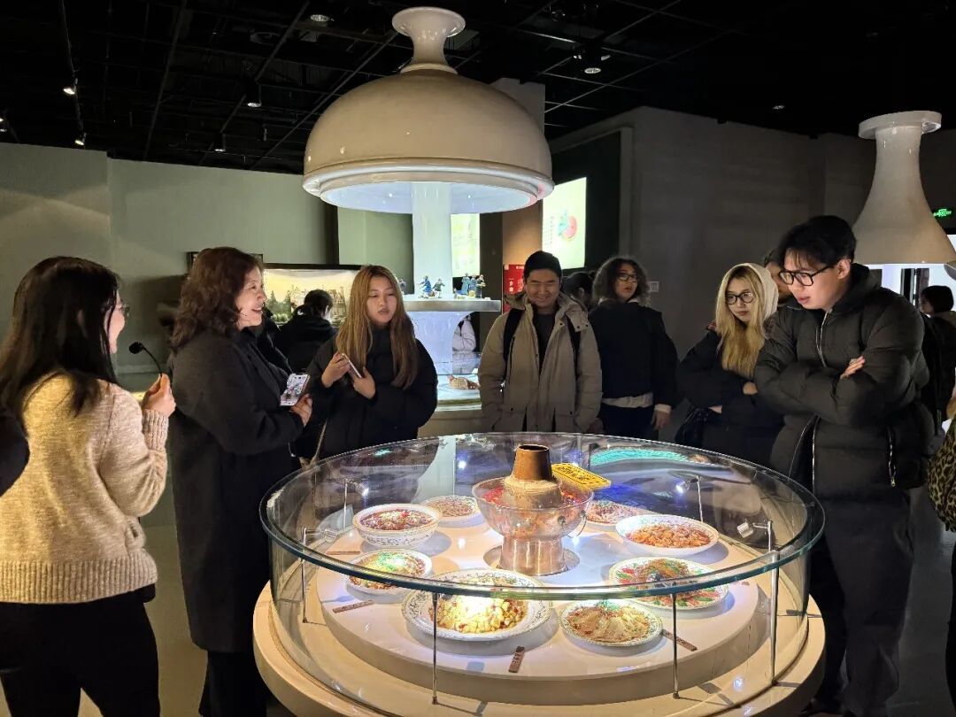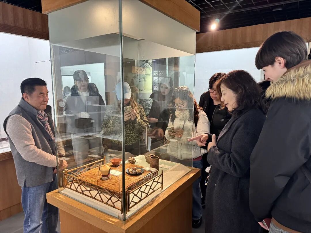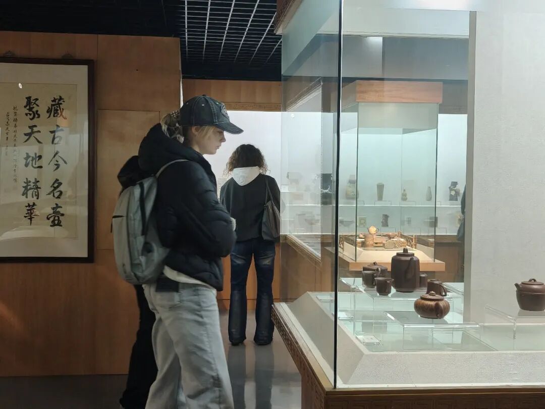 走进“海上宝山馆”,本土非遗不再是陈列于橱窗里的静态展品。月浦锣鼓的激越鼓声吸引留学生们轮番上前敲击,亲身体验北方鼓乐落户江南后的独特韵律。龙舟竞渡互动装置前,几位同学通过模拟击鼓驱动屏幕上的龙舟,感受端午竞渡的竞技激情。罗店灯彩、杨行吹塑纸版画、罗泾十字挑花等本土非遗项目,在讲解中呈现出宝山地区的文化根脉。 步入中国馆,“十里红妆”展项以惠山泥人再现传统婚嫁礼俗,戏曲展区通过幻影成像演绎京剧技艺。“满汉全席”与“四大菜系”展柜前,留学生们对着精致逼真的食物模型,交流起各自在中国各地品尝过的美食体验,从饮食文化延伸至地域习俗的交流讨论。 在“上海粲雅轩茶具文化艺术馆”,参观变成了一场深度对话。从明代时大彬的紫砂壶到清代陈鸣远的传世之作,黄福弟老师为同学们娓娓道来中国器物的故事。一位曾游历景德镇的俄罗斯同学主动分享自己的见闻。器物无言,却在这样的平等对话中,传递着跨越文明的情感温度。这正是“民艺新声”所追寻的——让展品背后的生活哲学,在人与人的交流中被真正“听见”。