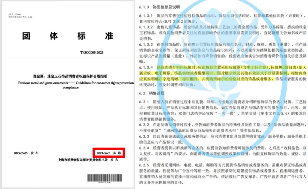 事实上,行业自律并非无章可循。2023年,上海市消保委联合上海黄金饰品行业协会、上海宝玉石行业协会、上海钻石行业协会及多家龙头企业,共同发布了《贵金属、珠宝玉石饰品消费者权益保护合规指引》。其中明确,在陈列饰品时,应在醒目位置标明饰品的规范名称、材质、规格、质量(重量)、生产或销售的企业名称等,保证所陈列的饰品与饰品标识相符;不以质量作为结算依据的足金素类饰品,宜标识产品的质量(重量)。