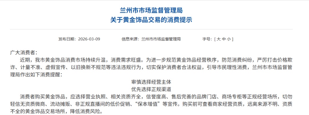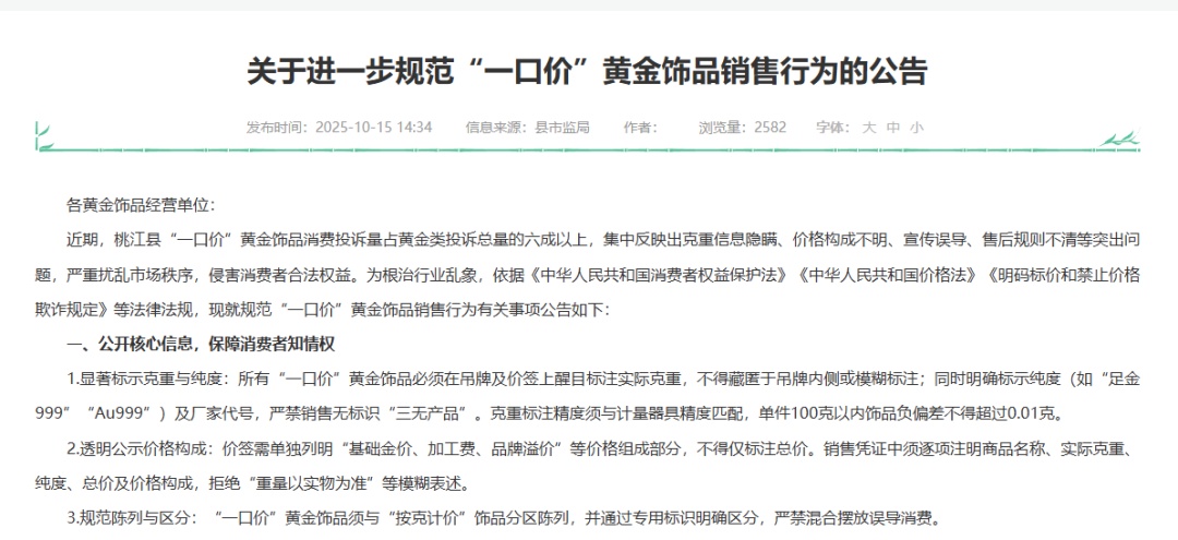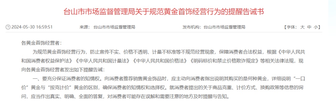 此外,记者在查阅相关资料时发现,一些市场监管部门,也陆续以《消费提示》《提醒告诫书》《规范公告》等形式,聚焦“一口价”黄金饰品的销售行为引导和规范。