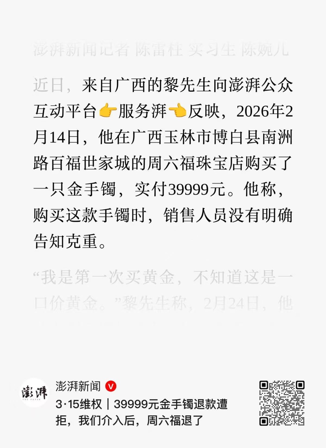 记者注意到,随着“一口价”黄金饰品在各地市场的持续热销,克重不透明、换购规则模糊等问题在各地都时有发生。如澎湃新闻这篇阅读量突破10万+的报道《3·15维权|39999元金手镯退款遭拒,我们介入后,周六福退了》,聚焦的就是今年2月14日,广西一名消费者在商家隐瞒克重的情况下,花费39999元购入黄金手镯的事件。