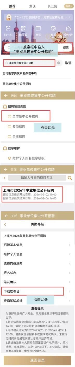登录随申办市民云 APP,搜索 “事业单位集中公开招聘” ,点击“全市集中公开招聘”,进入“下载准考证”栏目进行下载打印。