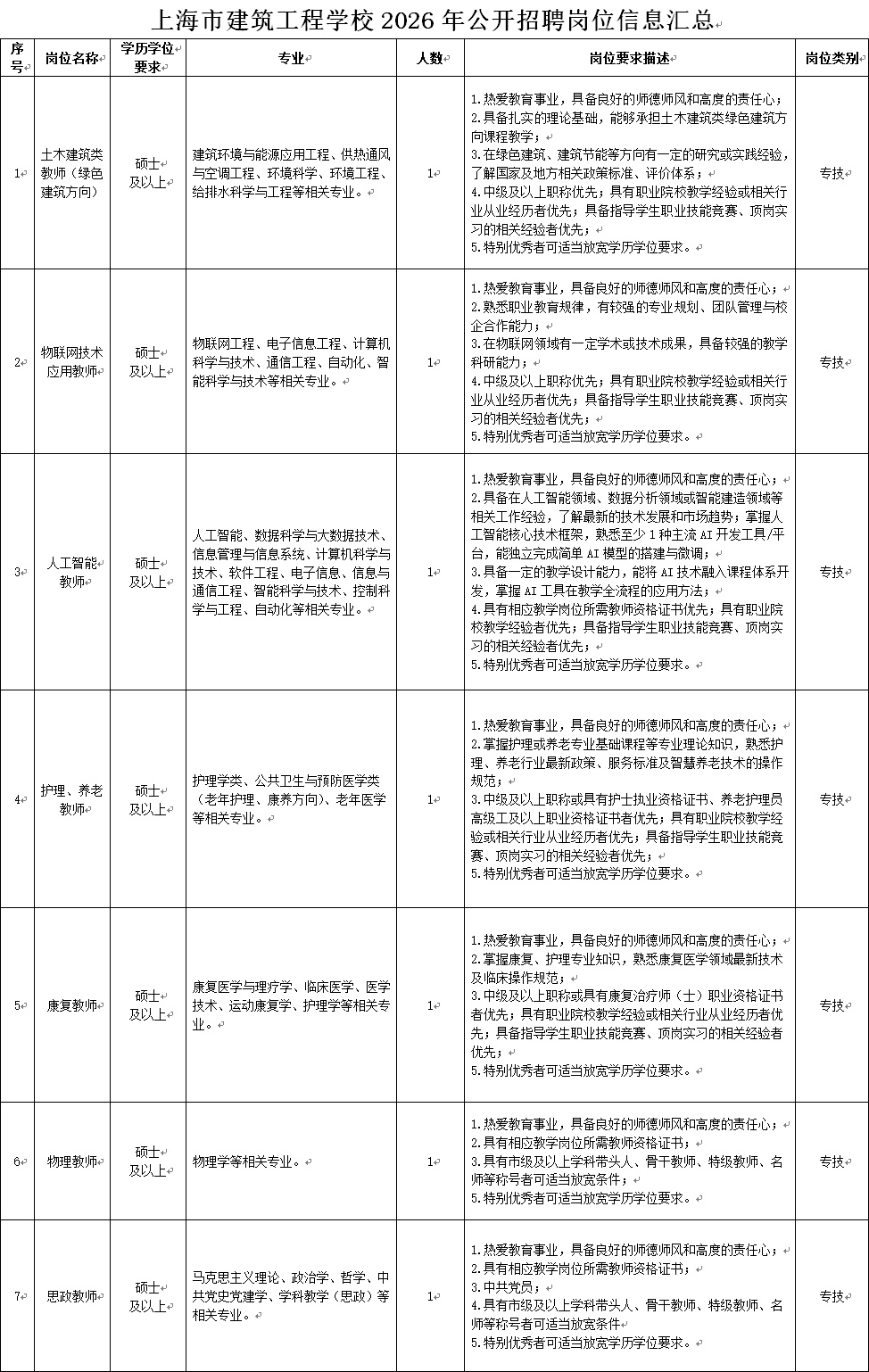 附件1 上海市建筑工程学校2026年公开招聘岗位信息汇总.docx
