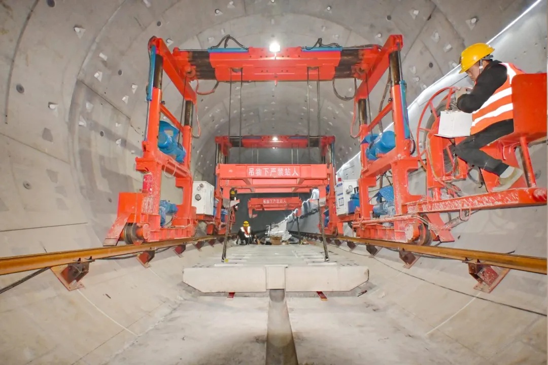 该项目由上海隧道院与上海隧道公司以工程总承包模式联合承建,其中轨道工程由中铁四局专业施工。铺轨作业内容包括钢轨、扣件、轨枕、道床、道岔、无缝线路及轨道附属设备的采购安装以及既有张江路站的接入改造工程等。除部分岔区、道床连接段等特殊段位外,99%的预制板道床采用地铁铺轨车“无轨法”拼装,道床运输、吊装、铺设、精调施工作业与安全管理以及一次成型的自密实混凝土垫层质量控制,是本工程的重点内容。针对丹桂路站设置的一组间距为12.24米的钢弹簧浮置板交叉渡线道床和道岔,采用“散铺法”拼装,该作业施工周期长、技术复杂且难度较大。同时,铺轨施工期间需频繁与土建、机电、信号等专业进行工序衔接,多界面协调工作量较大。