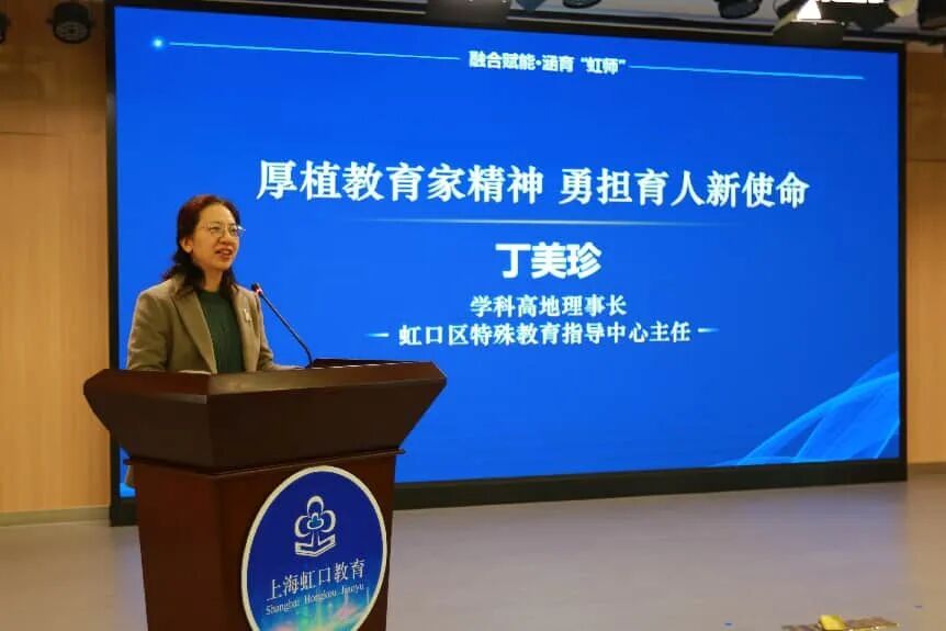 全国模范教师、全国最美教师、本轮高地理事长、虹口区特殊教育指导中心主任丁美珍作为人才梯队代表发言。结合三十余年深耕特殊教育和融合教育的一线实践,她分享了对教育家精神的深刻理解与践行体会,表达了投身新一轮人才梯队建设的责任担当与行动决心。