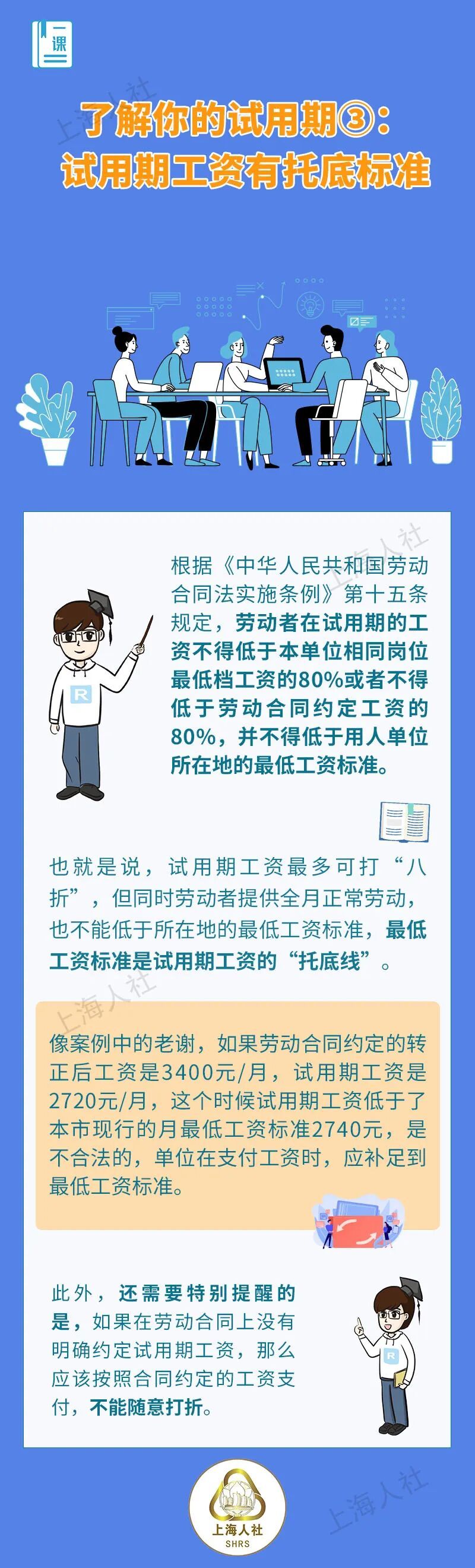 老谢上个月应聘到一家物业公司做绿化保养工,双方签订了3年的劳动合同。合同约定,老谢的工资是3400元,试用期2个月,试用期工资打八折,也就是2720元。老谢在手机上刷到的视频说,现在上海的月最低工资标准已经调整到2740元了。试用期工资有托底吗?可以低于最低工资吗?一起来看解答↓