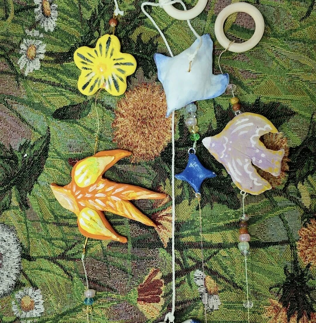 随后结合曾成钢雕塑作品"百鸟鸣天"系列,体验活动老师将引导大家从百鸟的形态神韵中获取创作灵感,感受百鸟灵动的神态,用超轻黏土捏制千姿百态的飞鸟,用丙烯颜料添画色彩与花纹,再搭配彩珠与铃铛,以彩线串联固定,制作春日里独一无二的百鸟风铃。