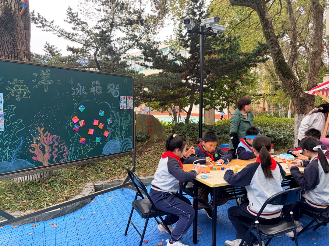 今年华坪小学一年一度的“世界水日”活动以“知水、爱水、节约水资源”为主题,当天学校内气氛热烈,孩子们头上戴着自己亲手制作的水滴头饰穿梭在教学楼前蓝色小广场上的展位间,像极了一场以水为主题的游园会。