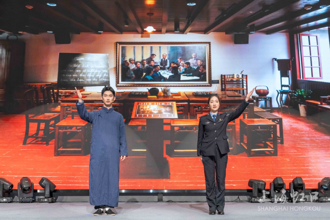 虹口公安分局青年宣讲员季欣奕、中共四大纪念馆青年宣讲员王子涵的情景宣讲《那一抹红 已漫山遍野》,将百年前中共四大召开时的紧张险境与当下的美好生活巧妙串联,通过宣讲员与“四大代表”的跨时空对话,让观众在沉浸式体验中感悟红色信仰的力量。这一宣讲片段选自虹口公安分局、中共四大纪念馆等单位联手创排的沉浸式宣讲情景剧《广吉里》。去年,该剧共展演40场,线上线下受众近17万人,深受青少年欢迎。