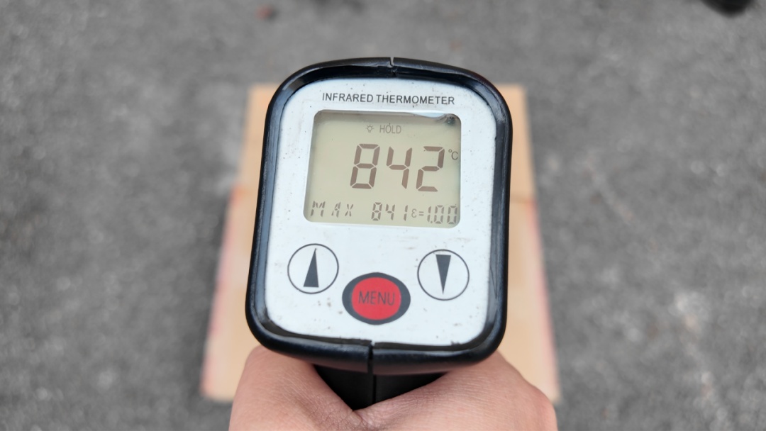 现场,消防人员特意在火盆下方铺了一块厚纸板,随后将废纸、冥币放入火盆中点燃。随着火势不断蔓延,消防人员立即用温度仪对准燃烧的废纸进行测量,屏幕显示实时温度高达800多度,火盆外侧温度高达375度。就在此时,由于火盆持续被高温烘烤,下方铺垫的厚纸板开始冒烟,紧接着被引燃,火焰迅速沿火盆边缘向外蔓延。